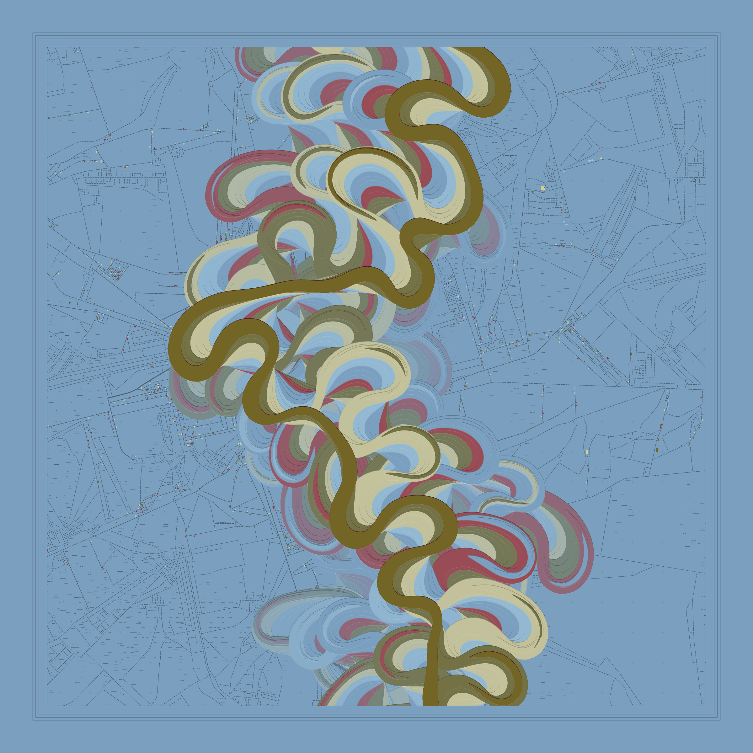 Ancient Courses is a generative experience that explores the aesthetics of meandering rivers and the settlements that form on their banks. The design is graphic and cartographic with bold color palettes rendered against map iconography and line sensibility. From the river banks, roads stretch across the landscape: sometimes a single access road, other times sprawling towns. The river meandering is simulated via a custom algorithm which closely models the real world process.