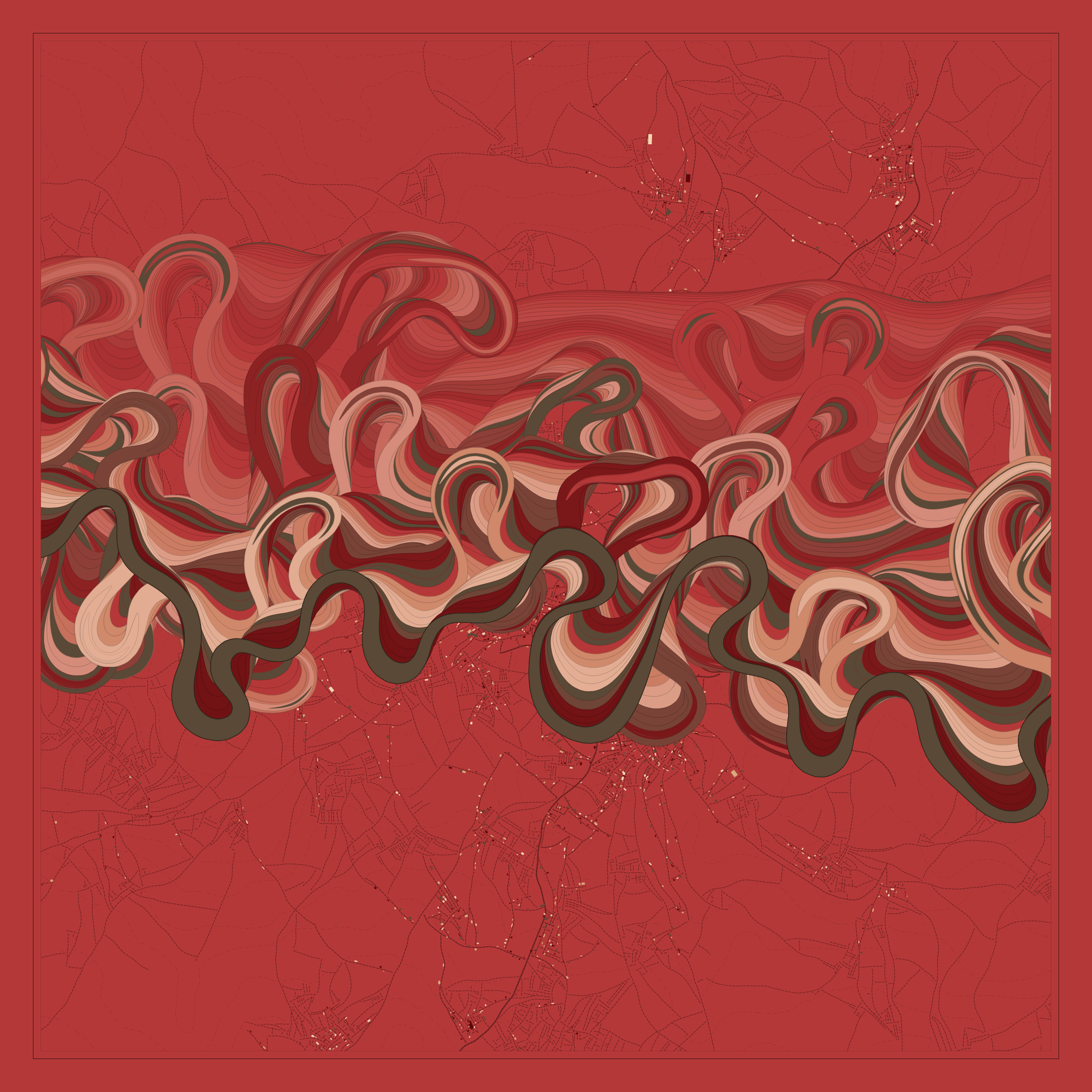 Ancient Courses is a generative experience that explores the aesthetics of meandering rivers and the settlements that form on their banks. The design is graphic and cartographic with bold color palettes rendered against map iconography and line sensibility. From the river banks, roads stretch across the landscape: sometimes a single access road, other times sprawling towns. The river meandering is simulated via a custom algorithm which closely models the real world process.
