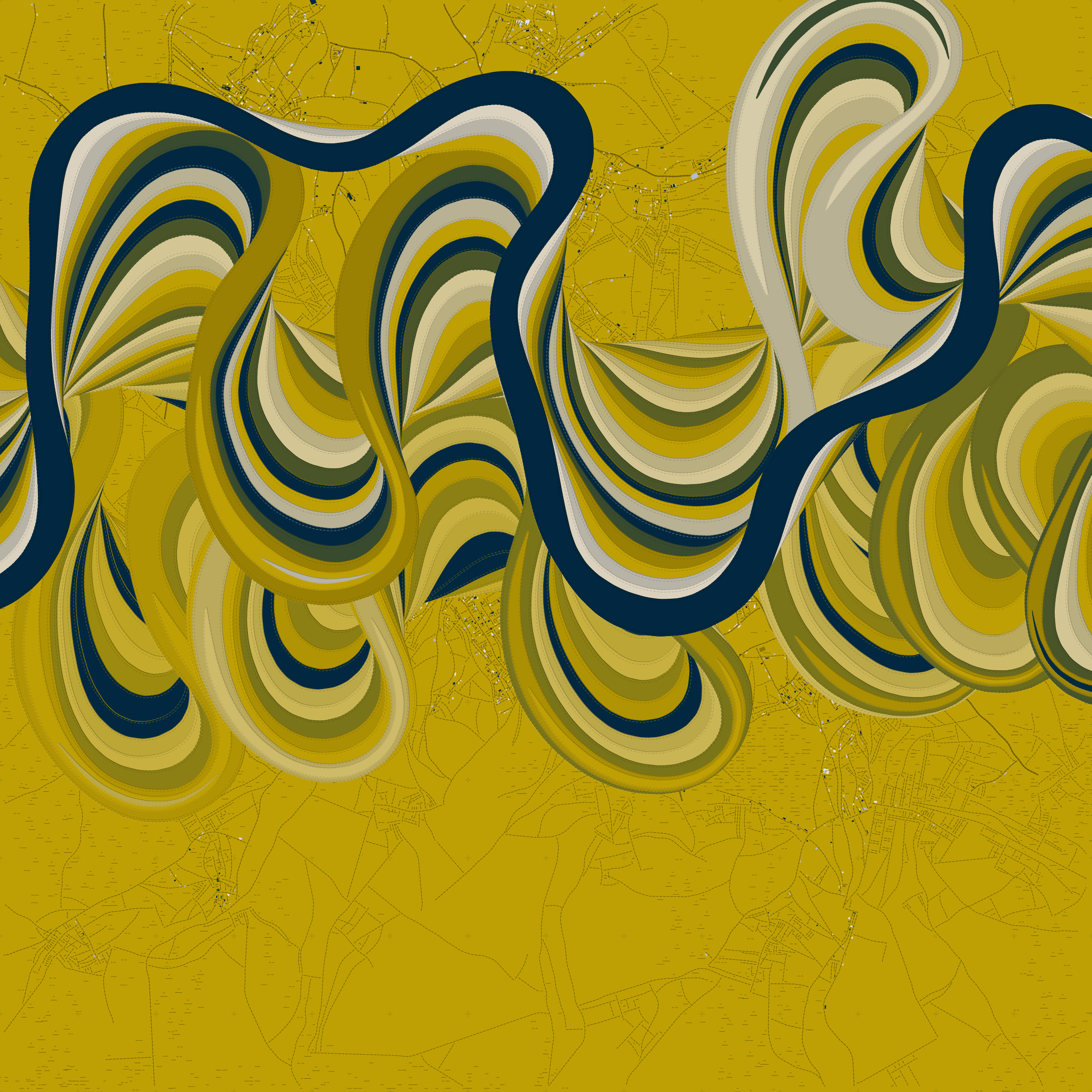 Ancient Courses is a generative experience that explores the aesthetics of meandering rivers and the settlements that form on their banks. The design is graphic and cartographic with bold color palettes rendered against map iconography and line sensibility. From the river banks, roads stretch across the landscape: sometimes a single access road, other times sprawling towns. The river meandering is simulated via a custom algorithm which closely models the real world process.