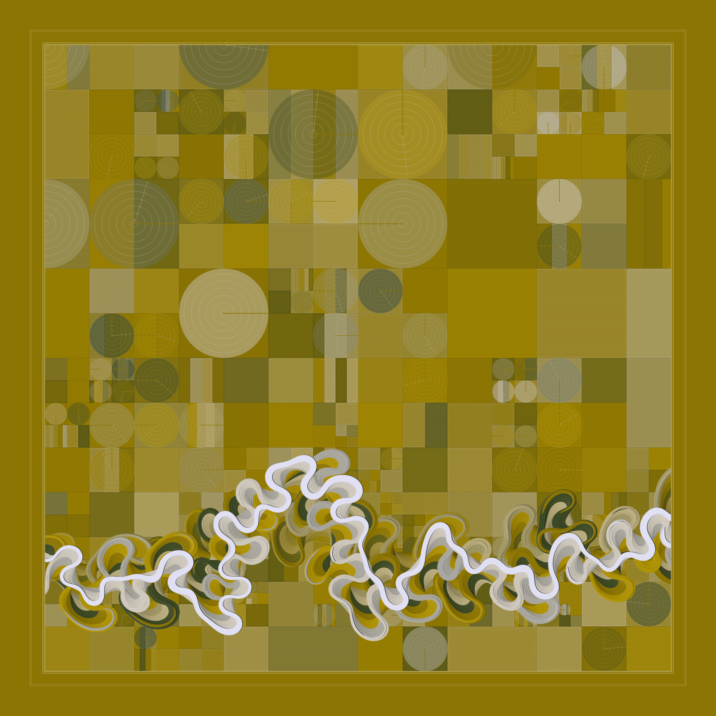 Ancient Courses is a generative experience that explores the aesthetics of meandering rivers and the settlements that form on their banks. The design is graphic and cartographic with bold color palettes rendered against map iconography and line sensibility. From the river banks, roads stretch across the landscape: sometimes a single access road, other times sprawling towns. The river meandering is simulated via a custom algorithm which closely models the real world process.