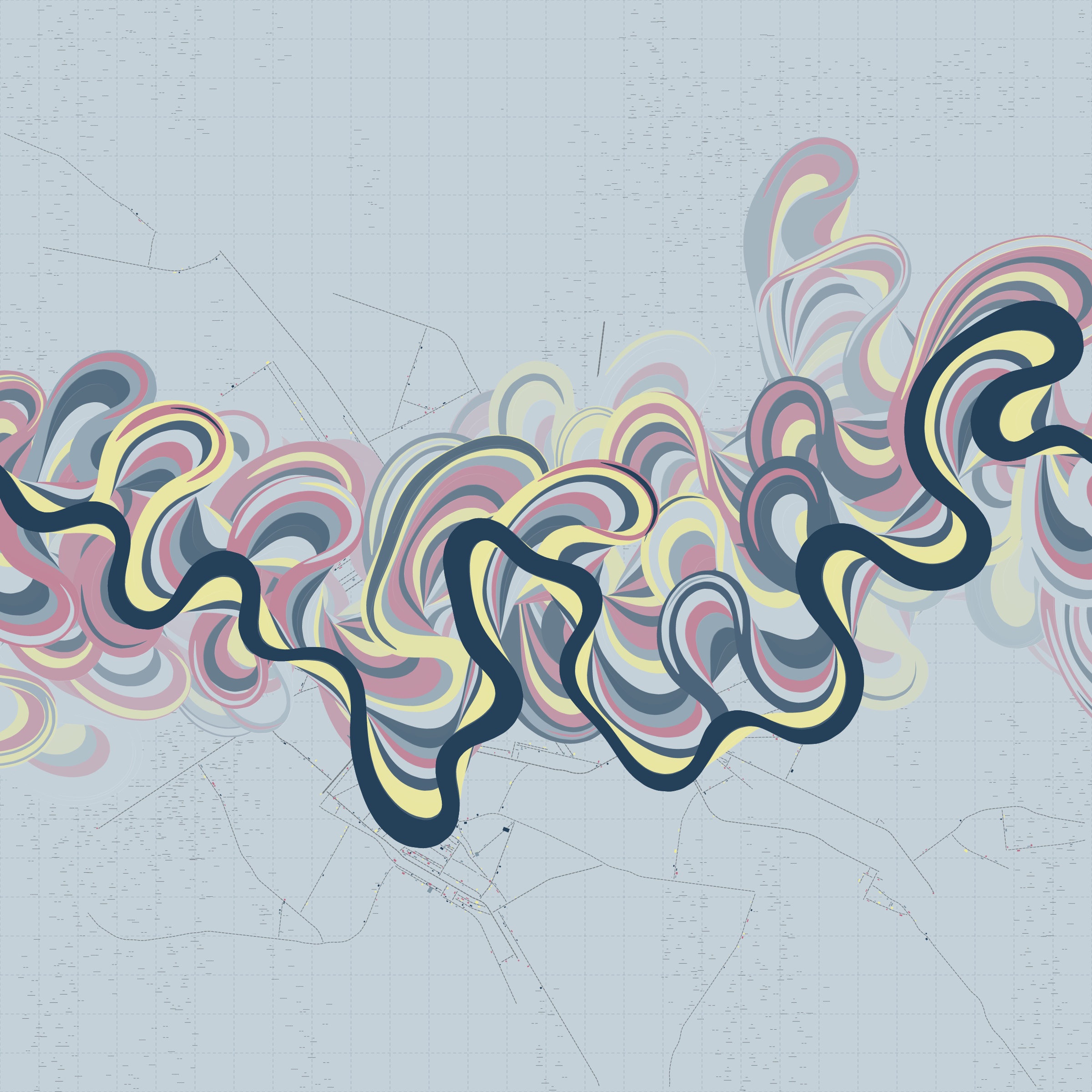 Ancient Courses is a generative experience that explores the aesthetics of meandering rivers and the settlements that form on their banks. The design is graphic and cartographic with bold color palettes rendered against map iconography and line sensibility. From the river banks, roads stretch across the landscape: sometimes a single access road, other times sprawling towns. The river meandering is simulated via a custom algorithm which closely models the real world process.
