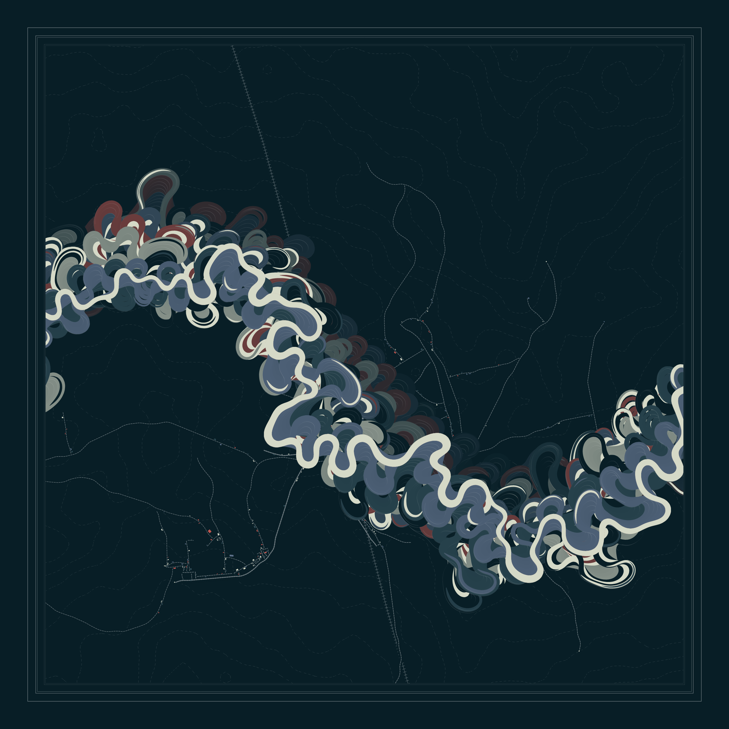 Ancient Courses is a generative experience that explores the aesthetics of meandering rivers and the settlements that form on their banks. The design is graphic and cartographic with bold color palettes rendered against map iconography and line sensibility. From the river banks, roads stretch across the landscape: sometimes a single access road, other times sprawling towns. The river meandering is simulated via a custom algorithm which closely models the real world process.