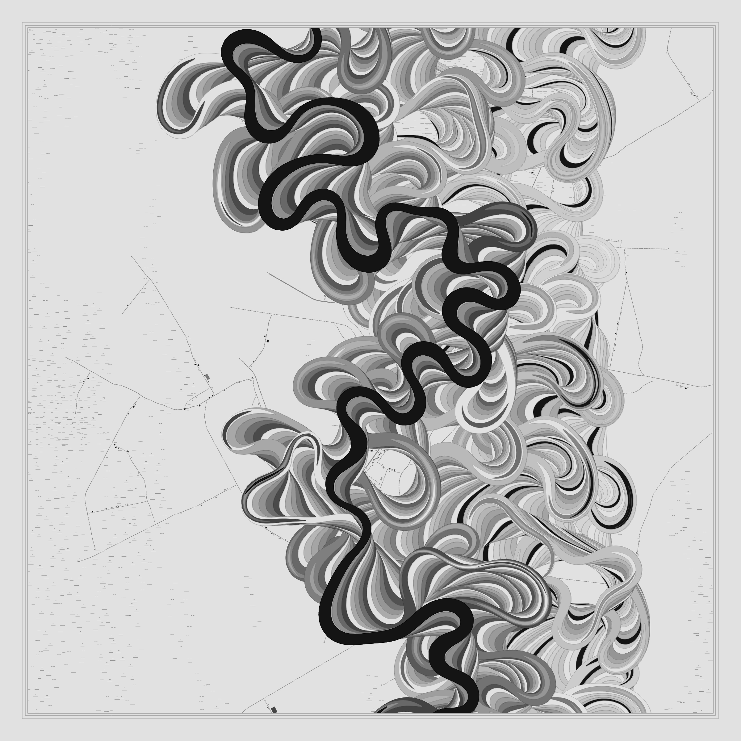 Ancient Courses is a generative experience that explores the aesthetics of meandering rivers and the settlements that form on their banks. The design is graphic and cartographic with bold color palettes rendered against map iconography and line sensibility. From the river banks, roads stretch across the landscape: sometimes a single access road, other times sprawling towns. The river meandering is simulated via a custom algorithm which closely models the real world process.