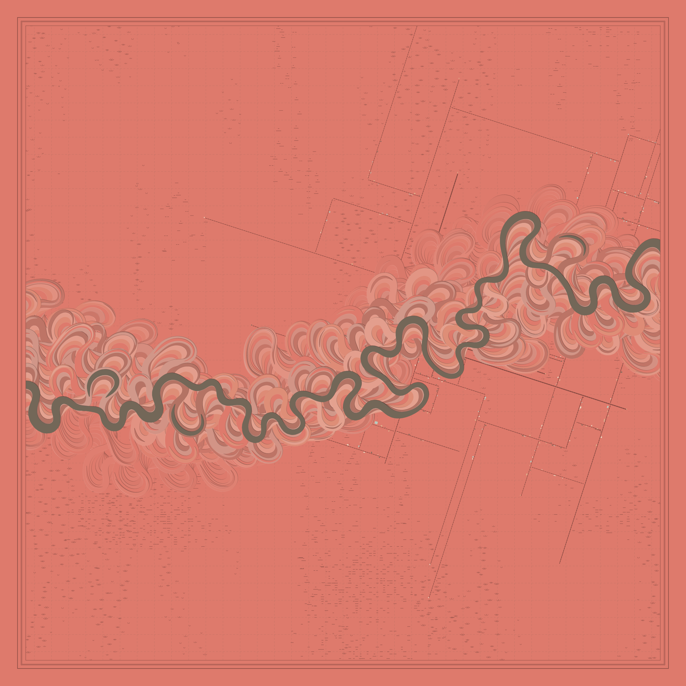Ancient Courses is a generative experience that explores the aesthetics of meandering rivers and the settlements that form on their banks. The design is graphic and cartographic with bold color palettes rendered against map iconography and line sensibility. From the river banks, roads stretch across the landscape: sometimes a single access road, other times sprawling towns. The river meandering is simulated via a custom algorithm which closely models the real world process.