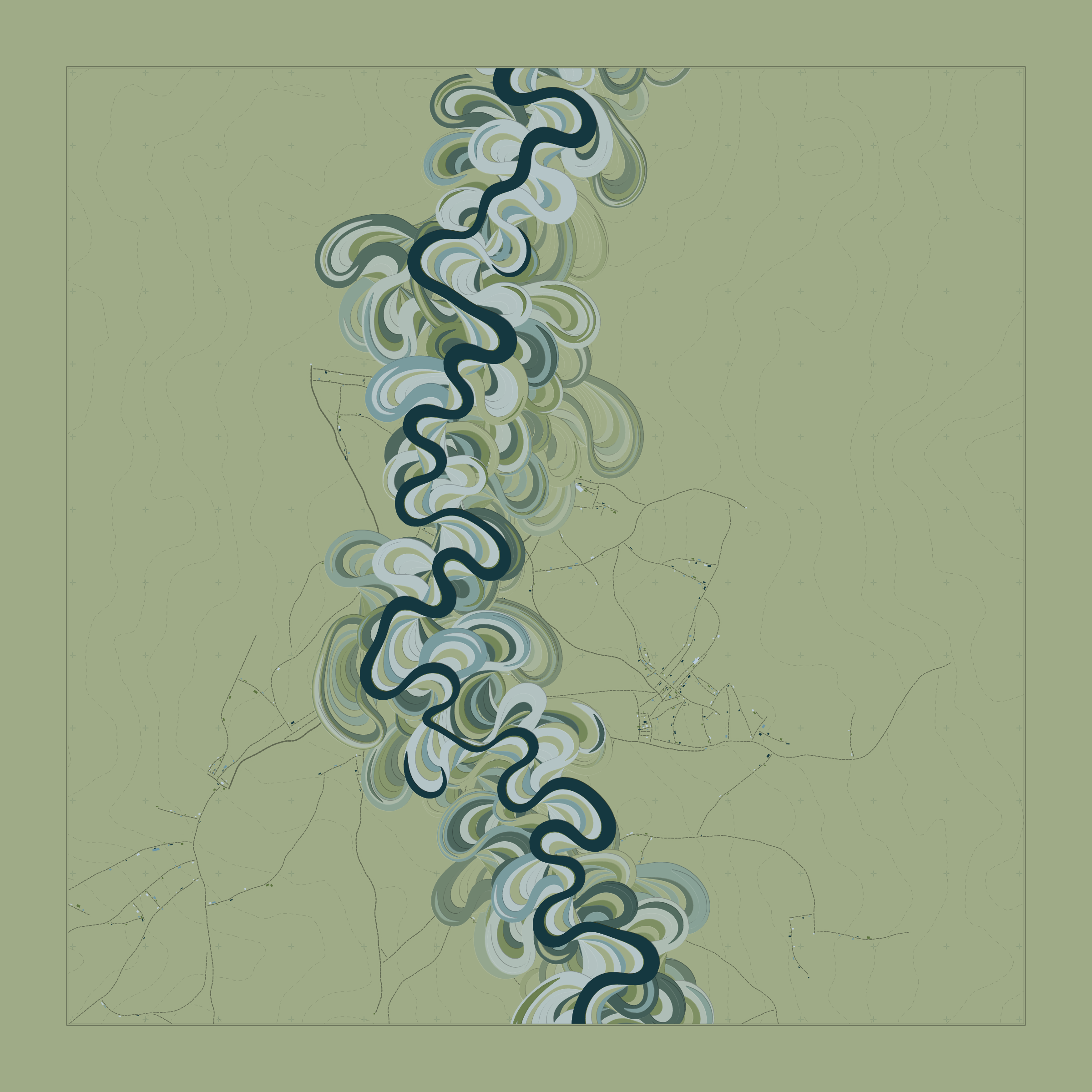 Ancient Courses is a generative experience that explores the aesthetics of meandering rivers and the settlements that form on their banks. The design is graphic and cartographic with bold color palettes rendered against map iconography and line sensibility. From the river banks, roads stretch across the landscape: sometimes a single access road, other times sprawling towns. The river meandering is simulated via a custom algorithm which closely models the real world process.