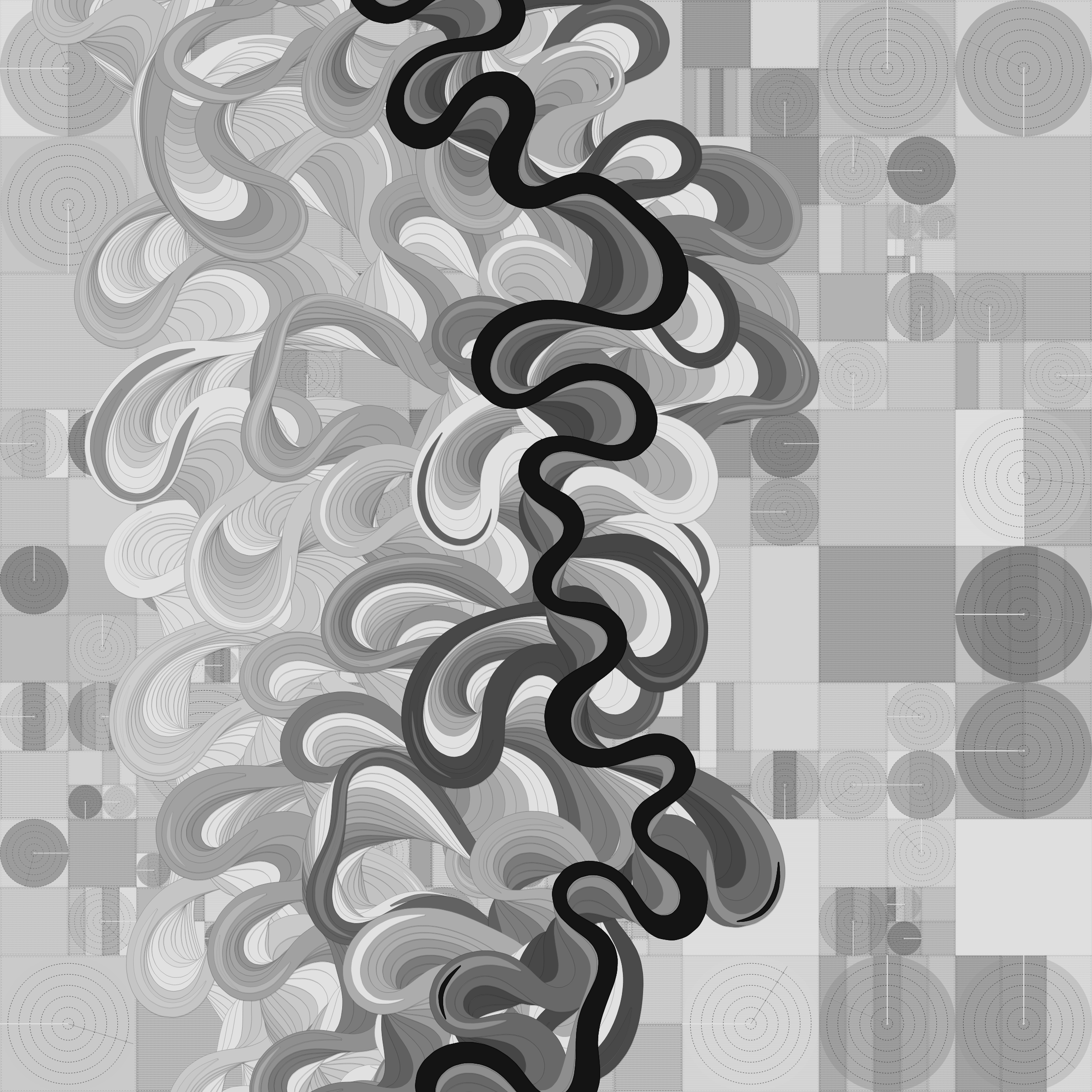 Ancient Courses is a generative experience that explores the aesthetics of meandering rivers and the settlements that form on their banks. The design is graphic and cartographic with bold color palettes rendered against map iconography and line sensibility. From the river banks, roads stretch across the landscape: sometimes a single access road, other times sprawling towns. The river meandering is simulated via a custom algorithm which closely models the real world process.