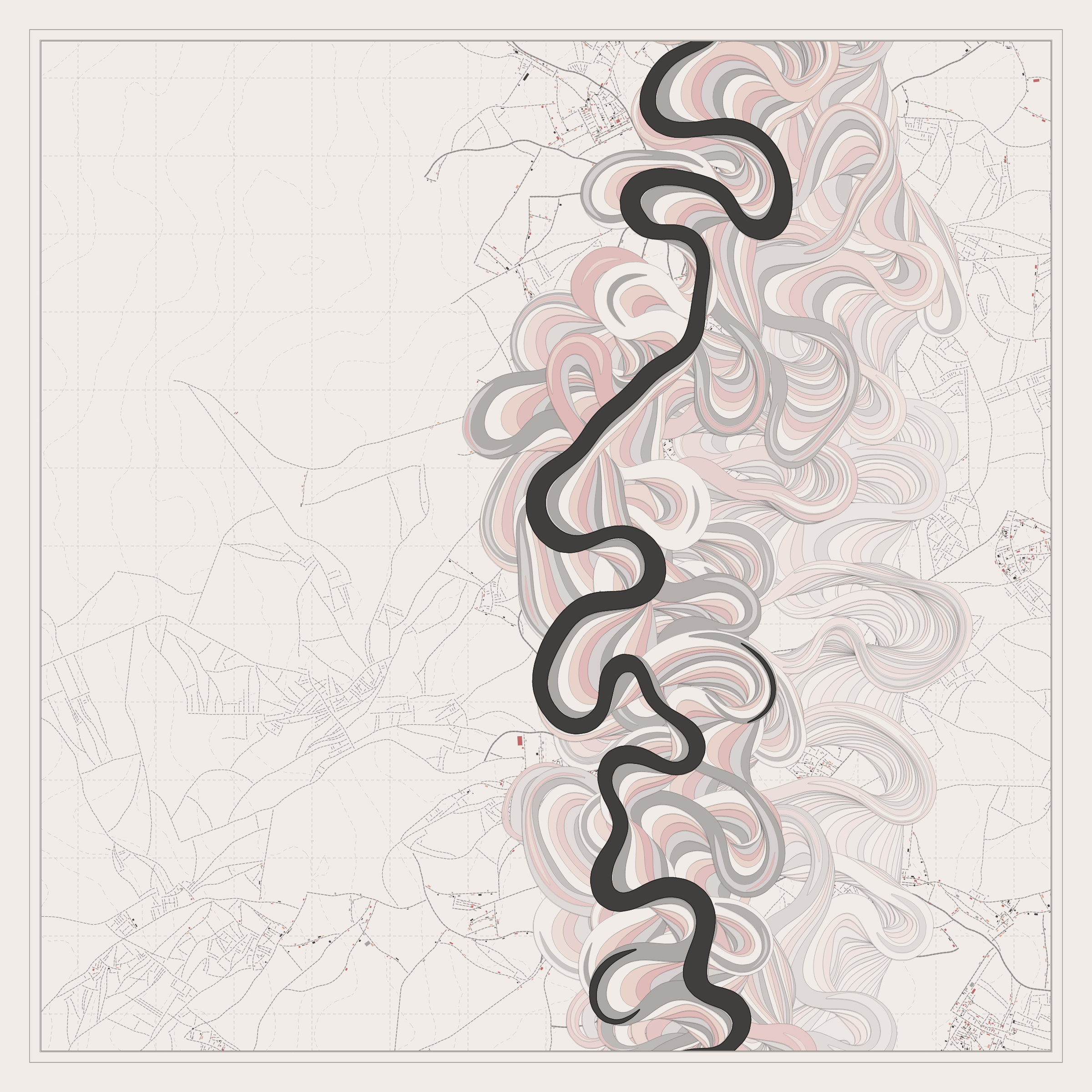Ancient Courses is a generative experience that explores the aesthetics of meandering rivers and the settlements that form on their banks. The design is graphic and cartographic with bold color palettes rendered against map iconography and line sensibility. From the river banks, roads stretch across the landscape: sometimes a single access road, other times sprawling towns. The river meandering is simulated via a custom algorithm which closely models the real world process.