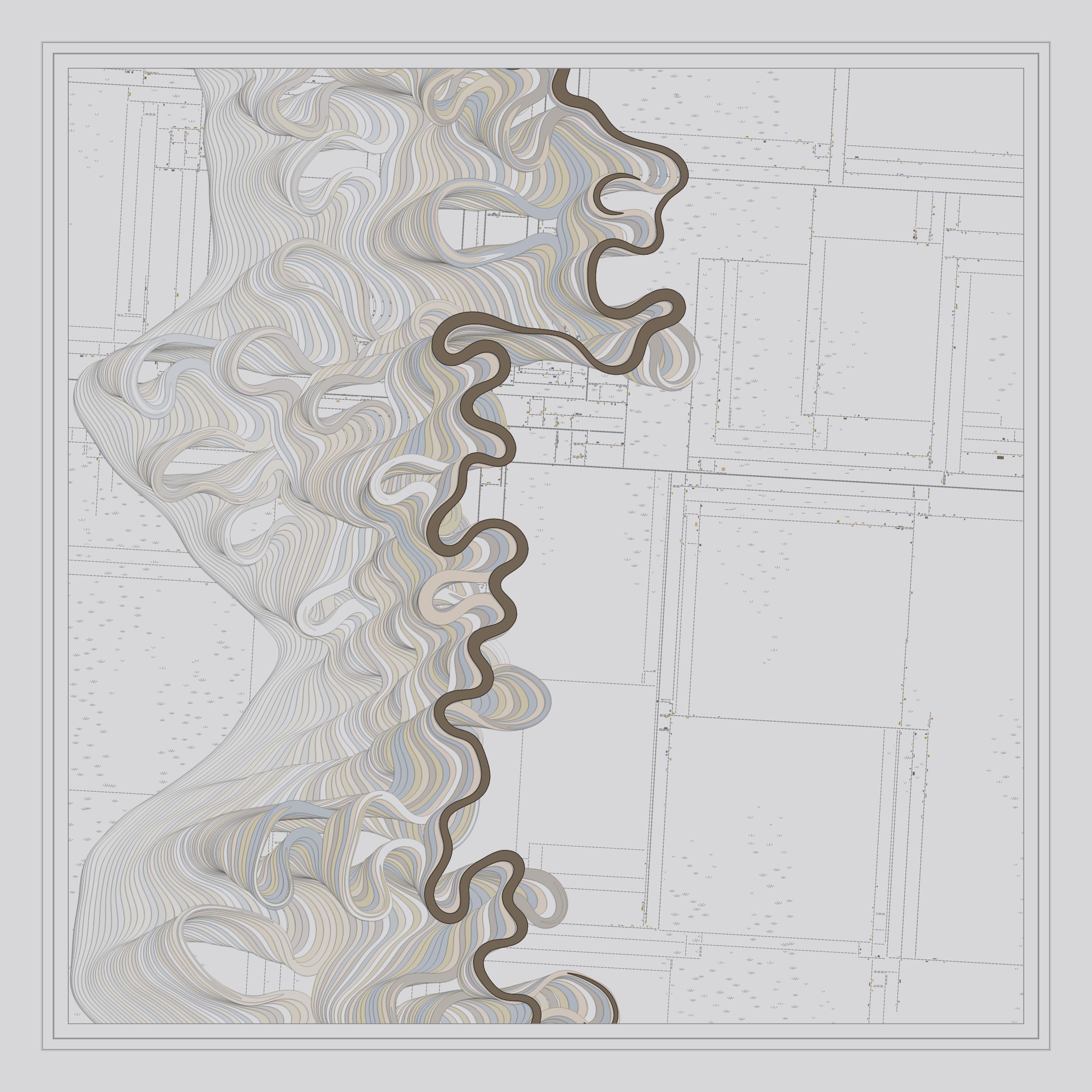 Ancient Courses is a generative experience that explores the aesthetics of meandering rivers and the settlements that form on their banks. The design is graphic and cartographic with bold color palettes rendered against map iconography and line sensibility. From the river banks, roads stretch across the landscape: sometimes a single access road, other times sprawling towns. The river meandering is simulated via a custom algorithm which closely models the real world process.