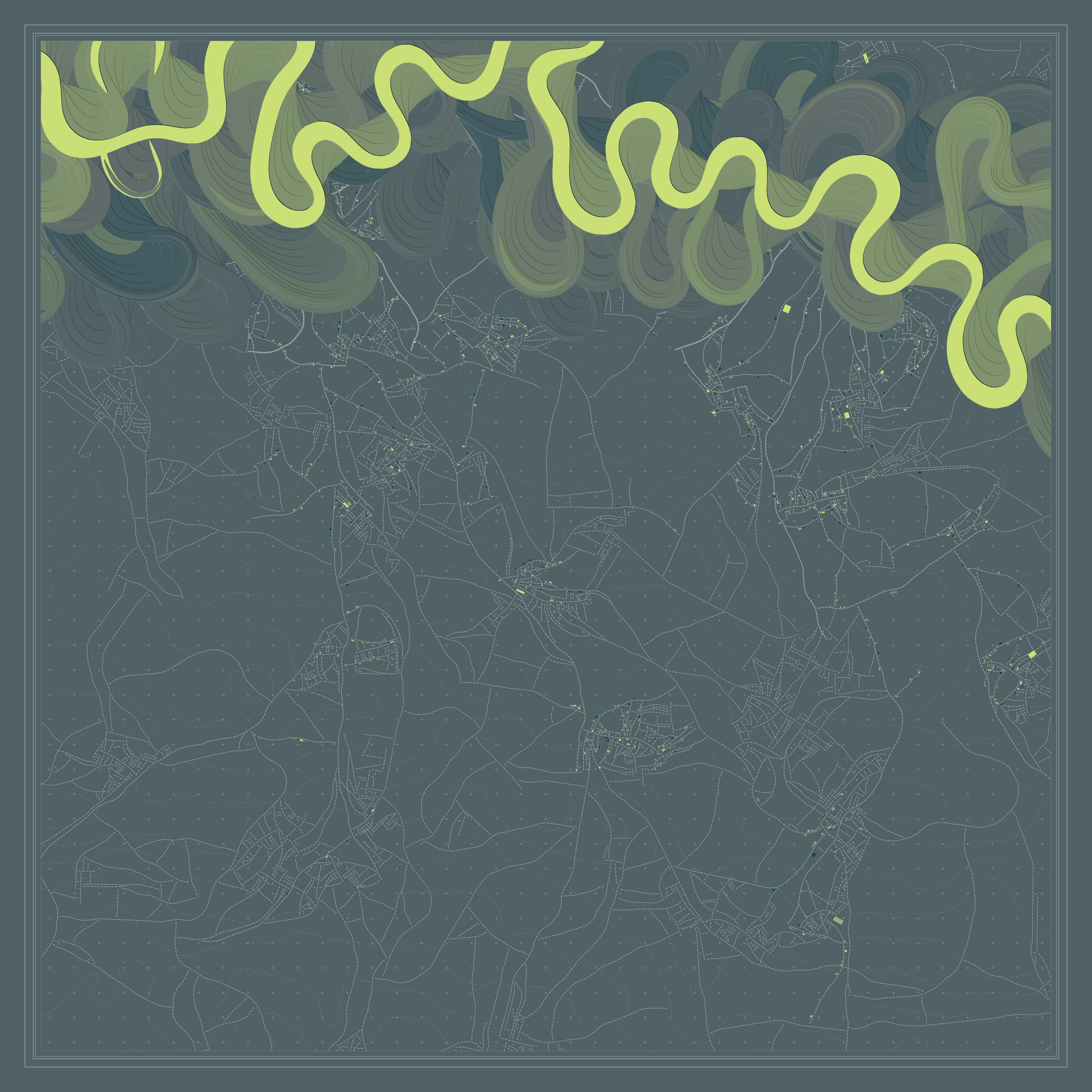 Ancient Courses is a generative experience that explores the aesthetics of meandering rivers and the settlements that form on their banks. The design is graphic and cartographic with bold color palettes rendered against map iconography and line sensibility. From the river banks, roads stretch across the landscape: sometimes a single access road, other times sprawling towns. The river meandering is simulated via a custom algorithm which closely models the real world process.