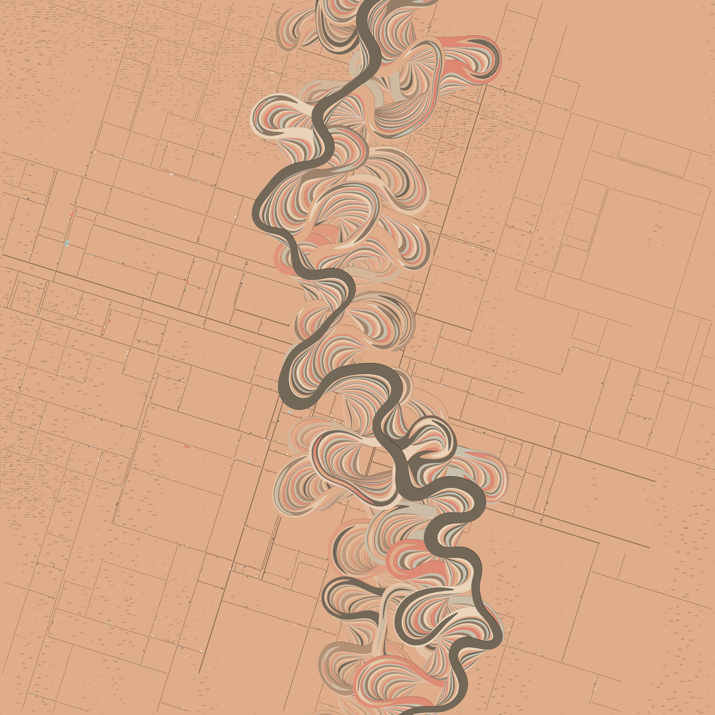 Ancient Courses is a generative experience that explores the aesthetics of meandering rivers and the settlements that form on their banks. The design is graphic and cartographic with bold color palettes rendered against map iconography and line sensibility. From the river banks, roads stretch across the landscape: sometimes a single access road, other times sprawling towns. The river meandering is simulated via a custom algorithm which closely models the real world process.