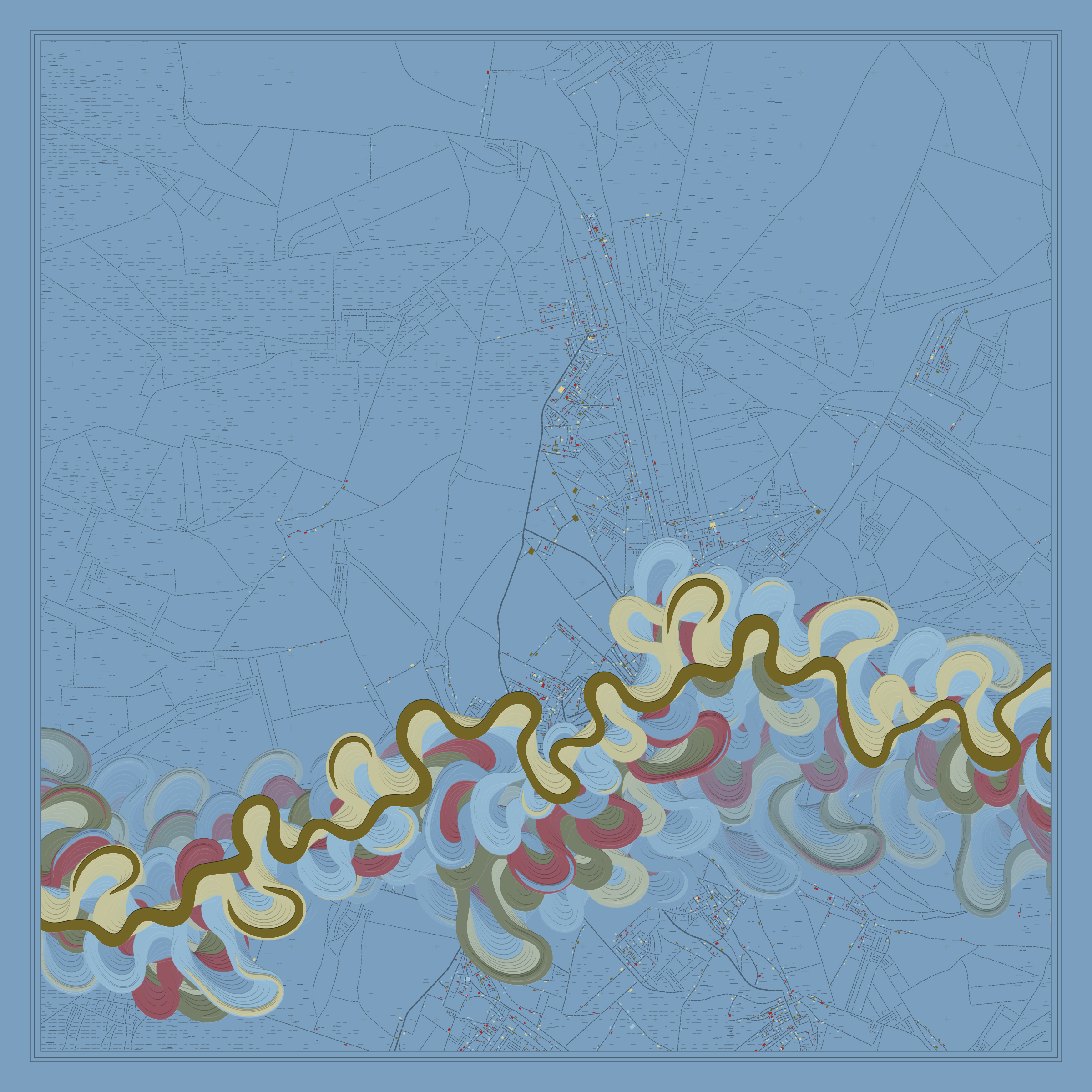 Ancient Courses is a generative experience that explores the aesthetics of meandering rivers and the settlements that form on their banks. The design is graphic and cartographic with bold color palettes rendered against map iconography and line sensibility. From the river banks, roads stretch across the landscape: sometimes a single access road, other times sprawling towns. The river meandering is simulated via a custom algorithm which closely models the real world process.