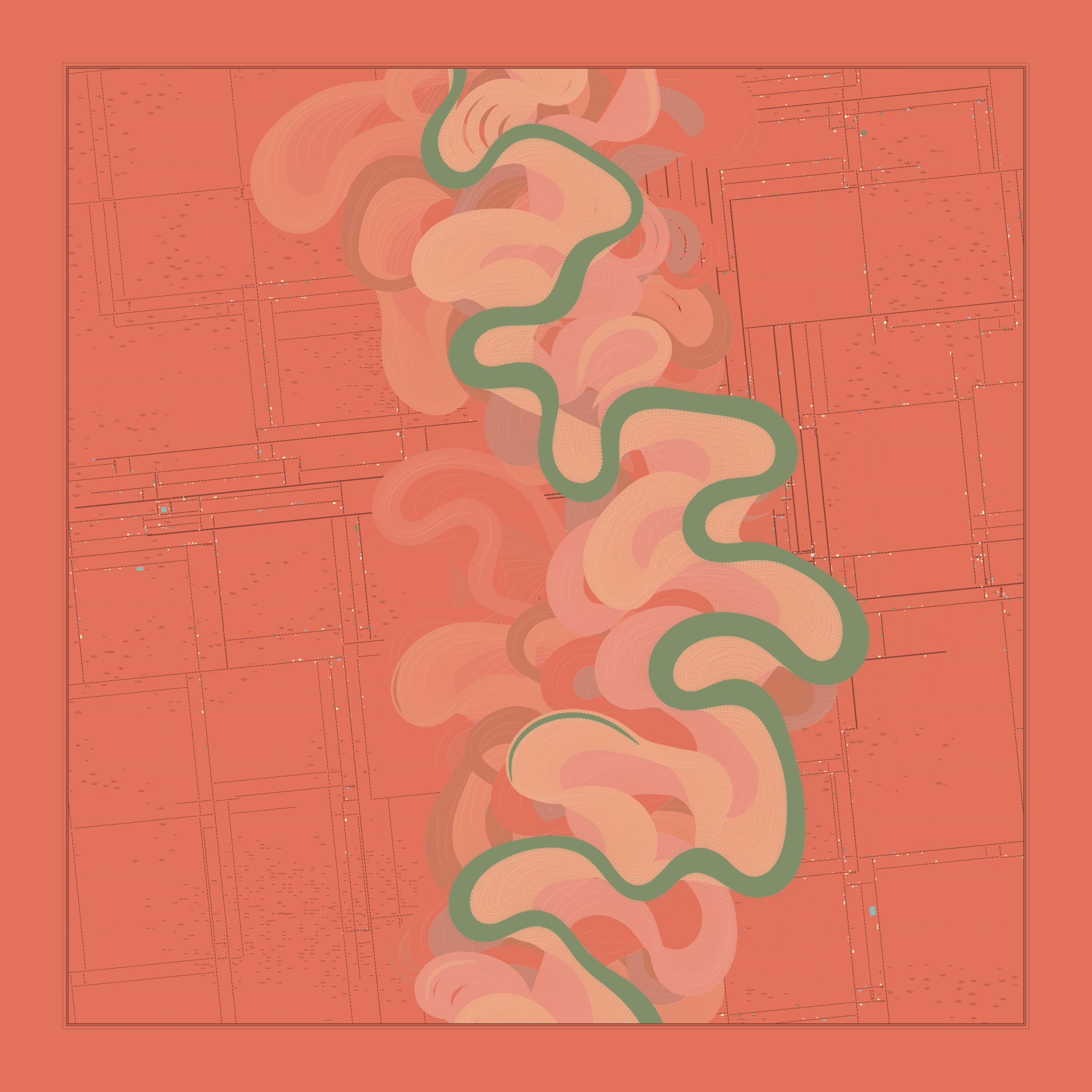 Ancient Courses is a generative experience that explores the aesthetics of meandering rivers and the settlements that form on their banks. The design is graphic and cartographic with bold color palettes rendered against map iconography and line sensibility. From the river banks, roads stretch across the landscape: sometimes a single access road, other times sprawling towns. The river meandering is simulated via a custom algorithm which closely models the real world process.