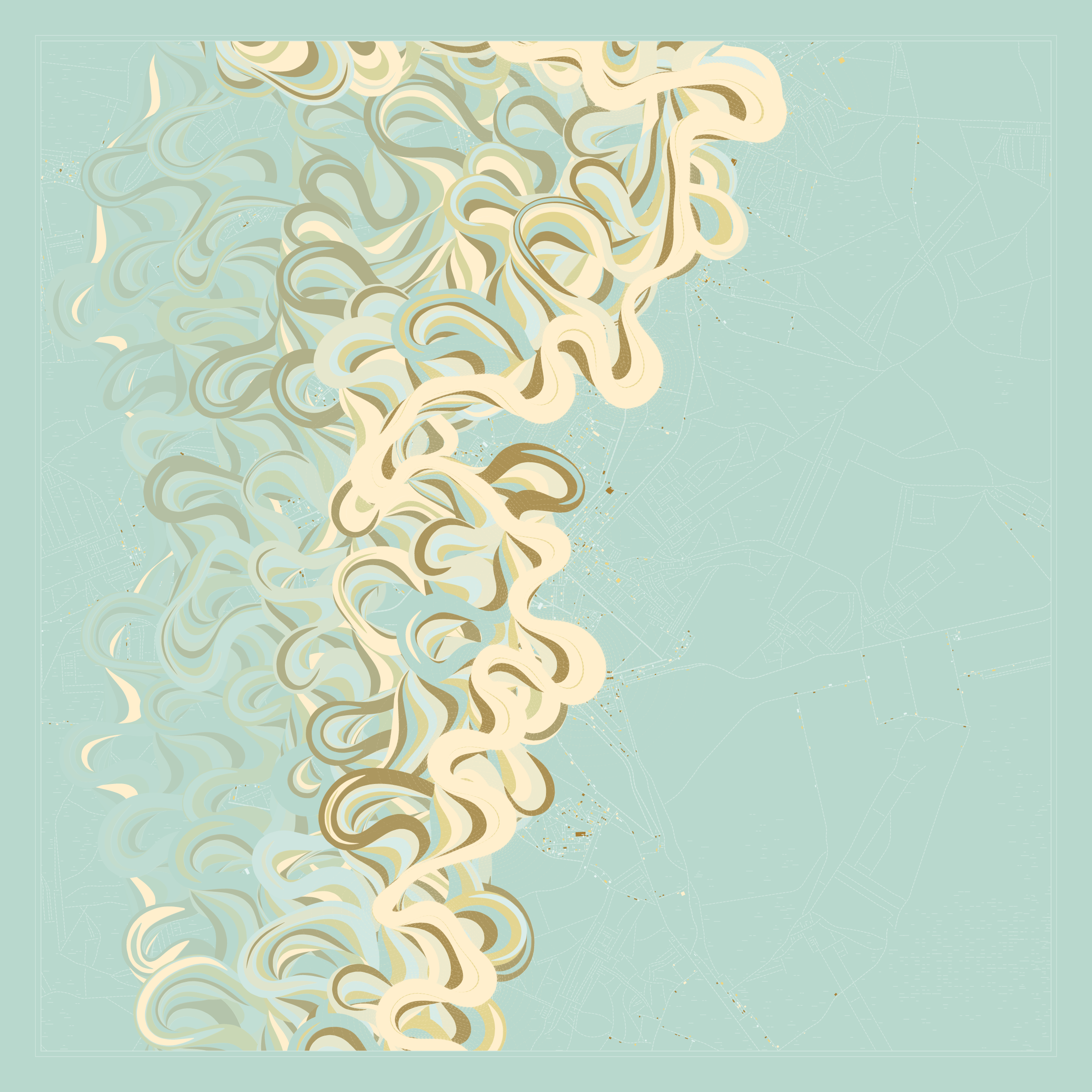 Ancient Courses is a generative experience that explores the aesthetics of meandering rivers and the settlements that form on their banks. The design is graphic and cartographic with bold color palettes rendered against map iconography and line sensibility. From the river banks, roads stretch across the landscape: sometimes a single access road, other times sprawling towns. The river meandering is simulated via a custom algorithm which closely models the real world process.