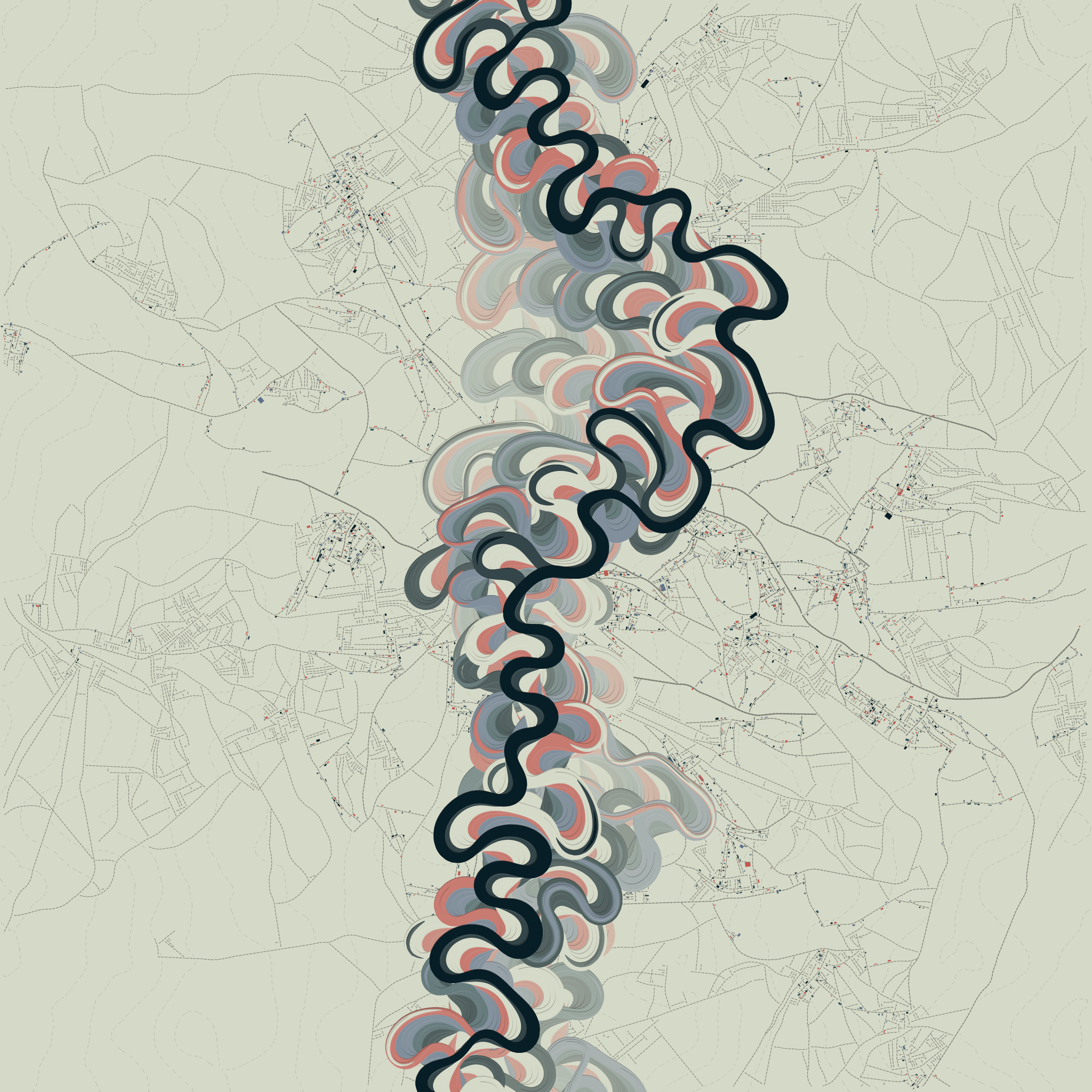 Ancient Courses is a generative experience that explores the aesthetics of meandering rivers and the settlements that form on their banks. The design is graphic and cartographic with bold color palettes rendered against map iconography and line sensibility. From the river banks, roads stretch across the landscape: sometimes a single access road, other times sprawling towns. The river meandering is simulated via a custom algorithm which closely models the real world process.