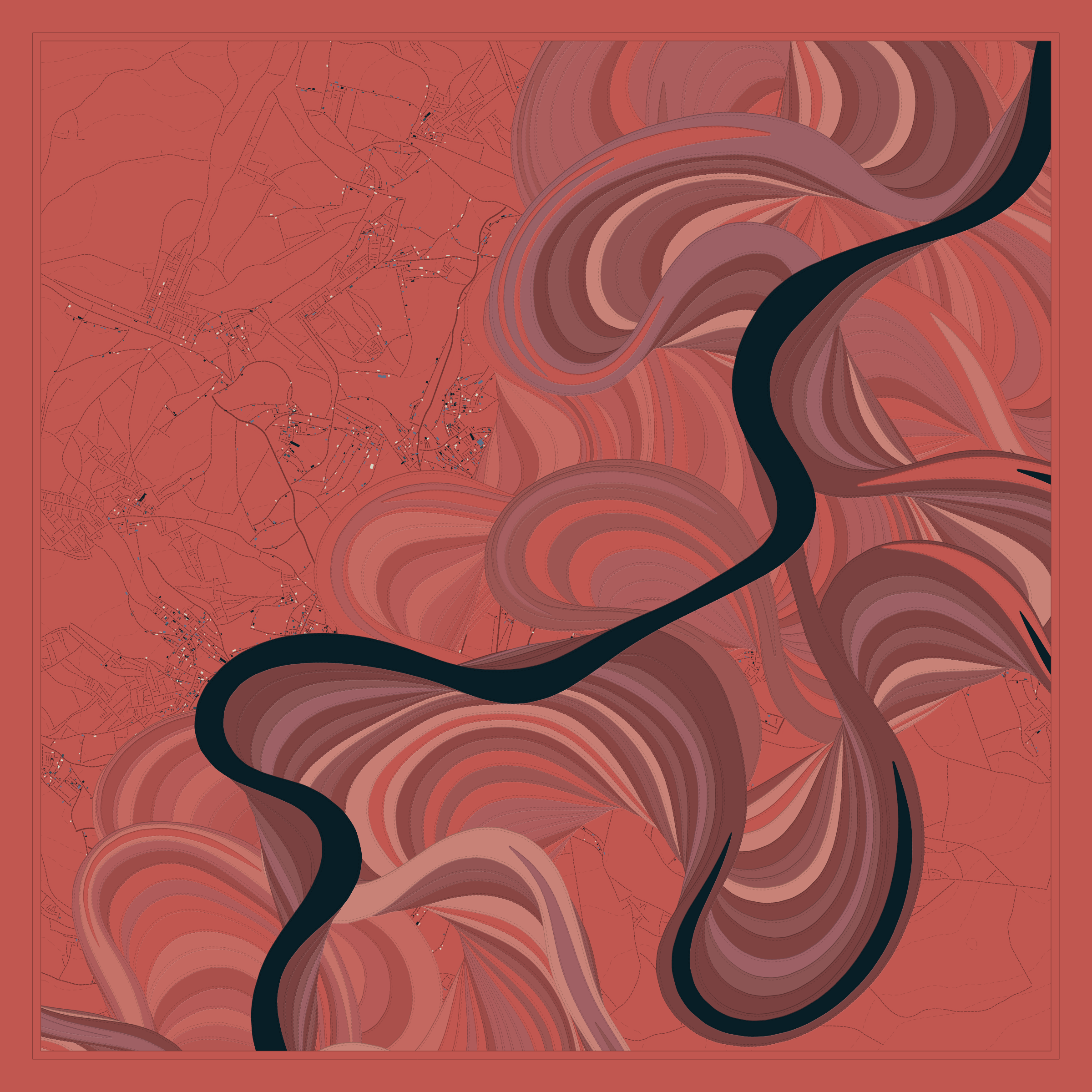 Ancient Courses is a generative experience that explores the aesthetics of meandering rivers and the settlements that form on their banks. The design is graphic and cartographic with bold color palettes rendered against map iconography and line sensibility. From the river banks, roads stretch across the landscape: sometimes a single access road, other times sprawling towns. The river meandering is simulated via a custom algorithm which closely models the real world process.