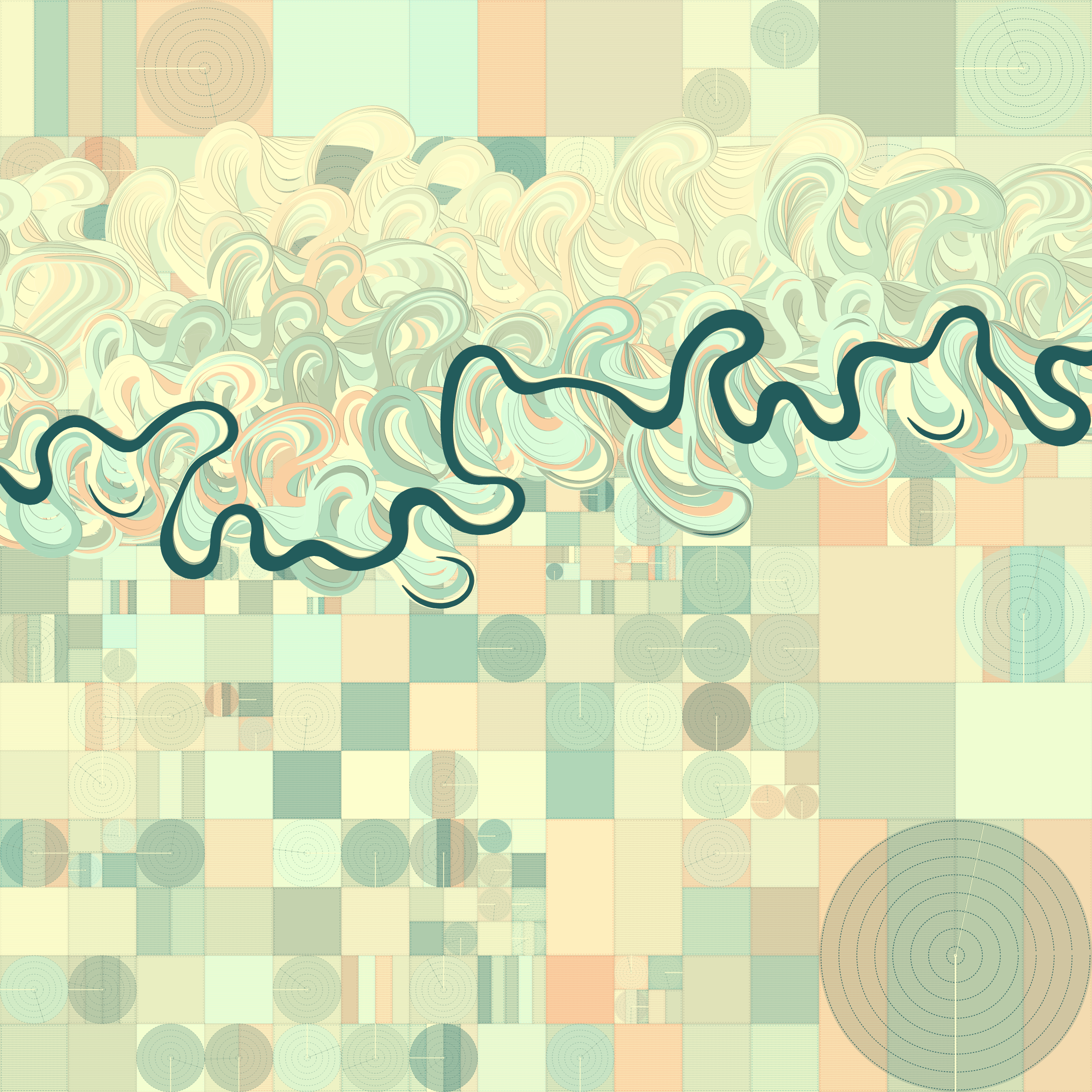 Ancient Courses is a generative experience that explores the aesthetics of meandering rivers and the settlements that form on their banks. The design is graphic and cartographic with bold color palettes rendered against map iconography and line sensibility. From the river banks, roads stretch across the landscape: sometimes a single access road, other times sprawling towns. The river meandering is simulated via a custom algorithm which closely models the real world process.