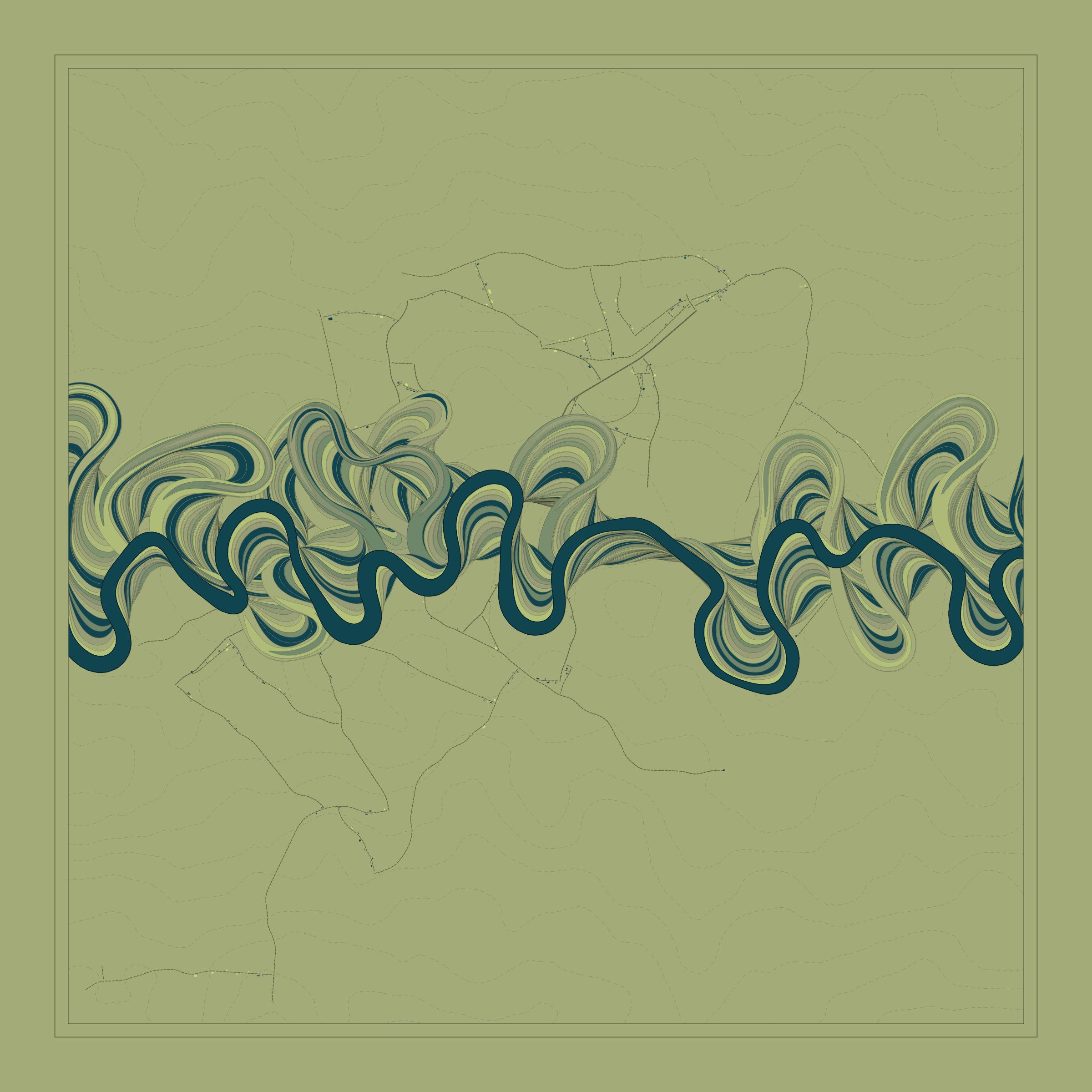Ancient Courses is a generative experience that explores the aesthetics of meandering rivers and the settlements that form on their banks. The design is graphic and cartographic with bold color palettes rendered against map iconography and line sensibility. From the river banks, roads stretch across the landscape: sometimes a single access road, other times sprawling towns. The river meandering is simulated via a custom algorithm which closely models the real world process.