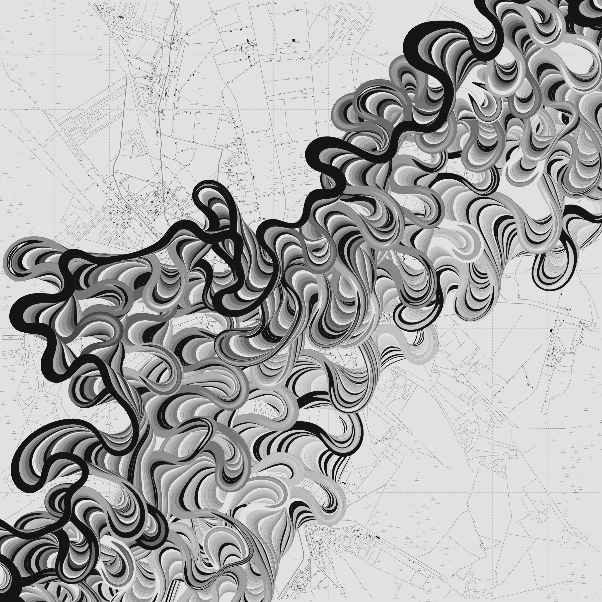 Ancient Courses is a generative experience that explores the aesthetics of meandering rivers and the settlements that form on their banks. The design is graphic and cartographic with bold color palettes rendered against map iconography and line sensibility. From the river banks, roads stretch across the landscape: sometimes a single access road, other times sprawling towns. The river meandering is simulated via a custom algorithm which closely models the real world process.