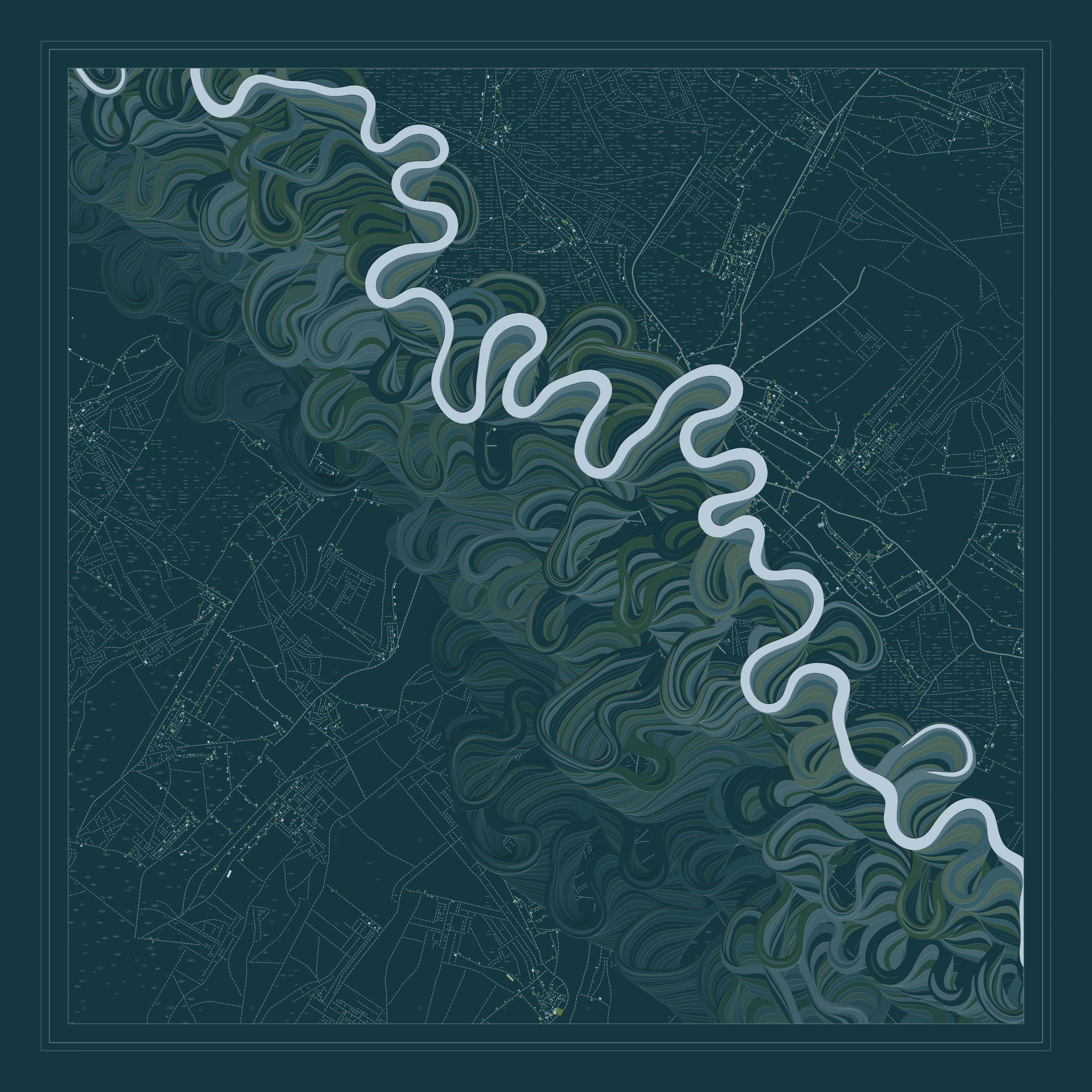 Ancient Courses is a generative experience that explores the aesthetics of meandering rivers and the settlements that form on their banks. The design is graphic and cartographic with bold color palettes rendered against map iconography and line sensibility. From the river banks, roads stretch across the landscape: sometimes a single access road, other times sprawling towns. The river meandering is simulated via a custom algorithm which closely models the real world process.