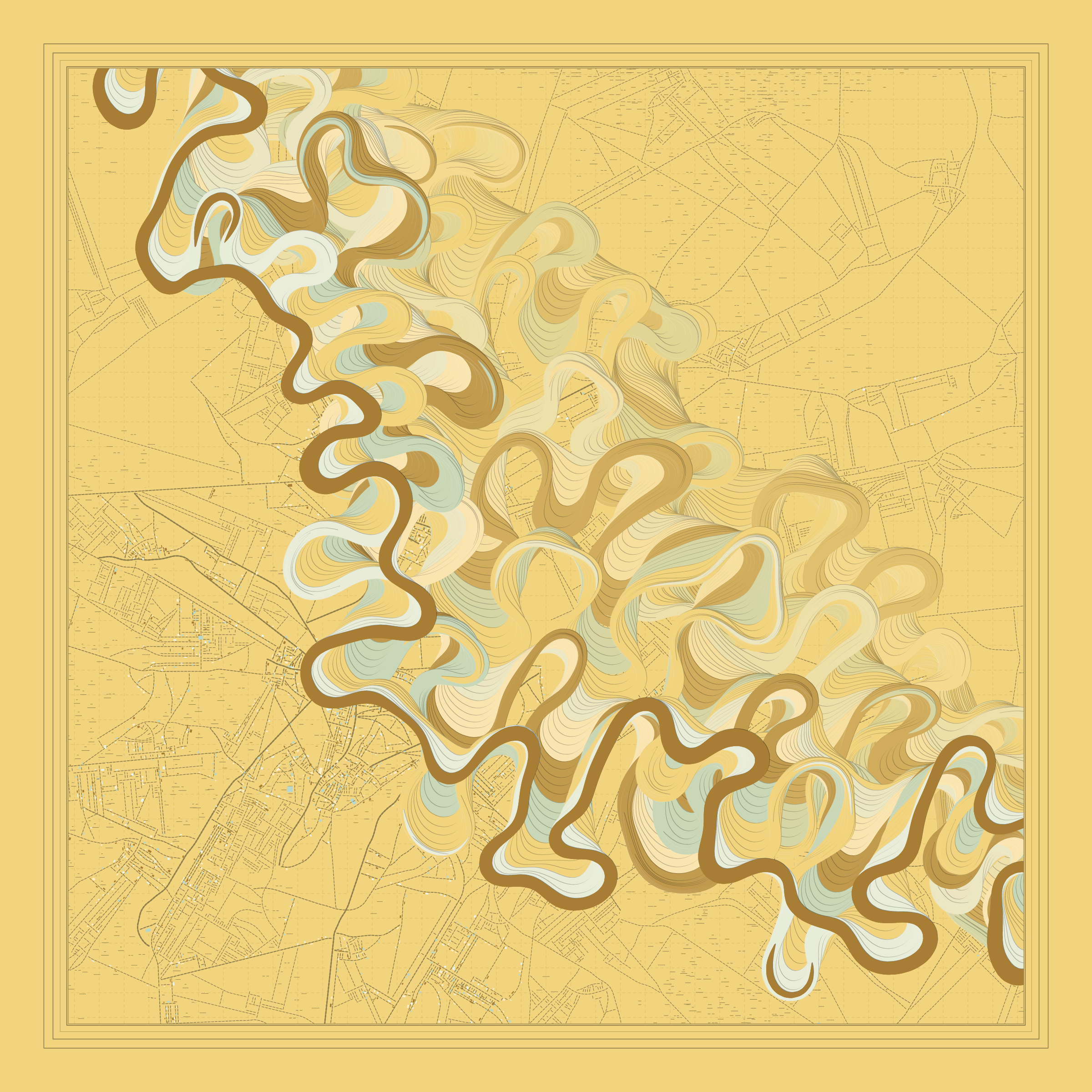 Ancient Courses is a generative experience that explores the aesthetics of meandering rivers and the settlements that form on their banks. The design is graphic and cartographic with bold color palettes rendered against map iconography and line sensibility. From the river banks, roads stretch across the landscape: sometimes a single access road, other times sprawling towns. The river meandering is simulated via a custom algorithm which closely models the real world process.