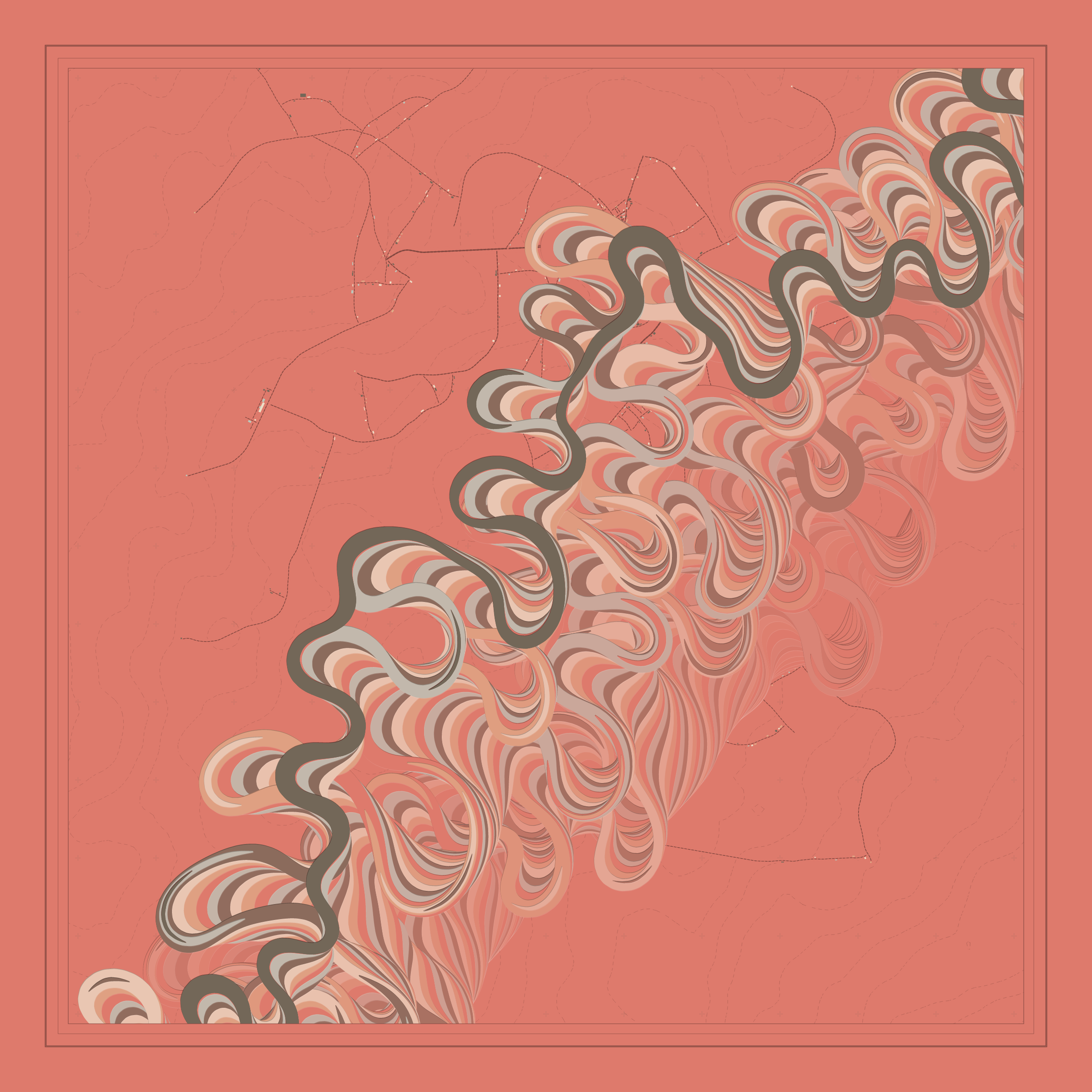 Ancient Courses is a generative experience that explores the aesthetics of meandering rivers and the settlements that form on their banks. The design is graphic and cartographic with bold color palettes rendered against map iconography and line sensibility. From the river banks, roads stretch across the landscape: sometimes a single access road, other times sprawling towns. The river meandering is simulated via a custom algorithm which closely models the real world process.
