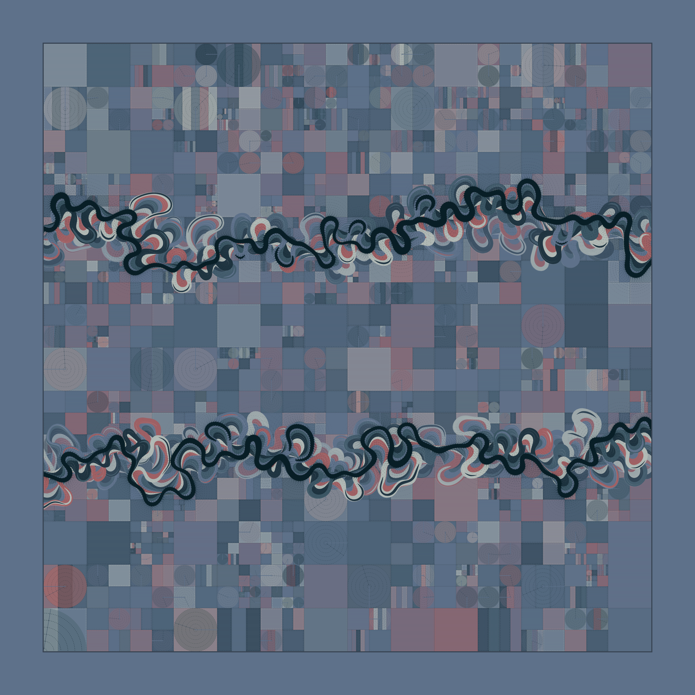 Ancient Courses is a generative experience that explores the aesthetics of meandering rivers and the settlements that form on their banks. The design is graphic and cartographic with bold color palettes rendered against map iconography and line sensibility. From the river banks, roads stretch across the landscape: sometimes a single access road, other times sprawling towns. The river meandering is simulated via a custom algorithm which closely models the real world process.