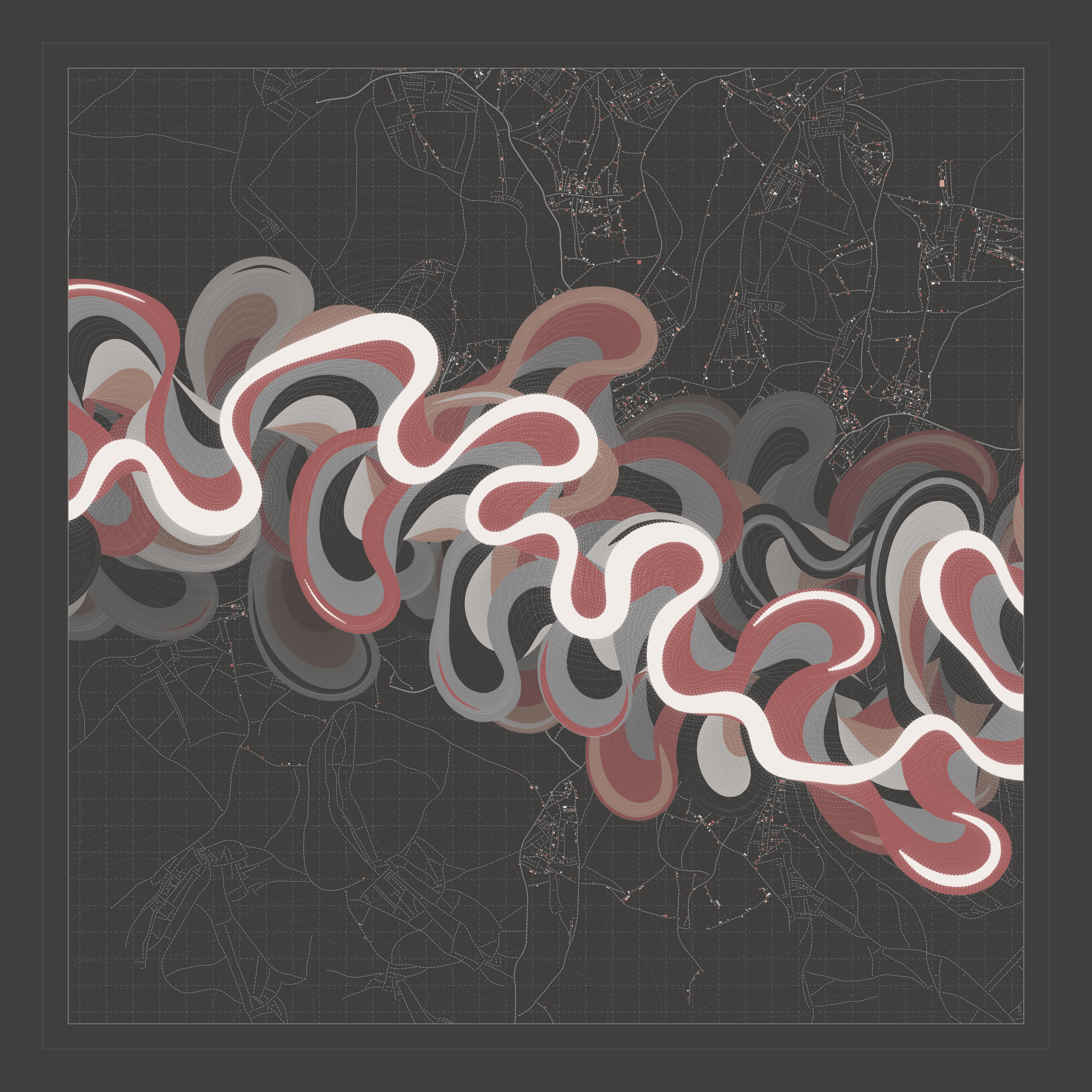 Ancient Courses is a generative experience that explores the aesthetics of meandering rivers and the settlements that form on their banks. The design is graphic and cartographic with bold color palettes rendered against map iconography and line sensibility. From the river banks, roads stretch across the landscape: sometimes a single access road, other times sprawling towns. The river meandering is simulated via a custom algorithm which closely models the real world process.