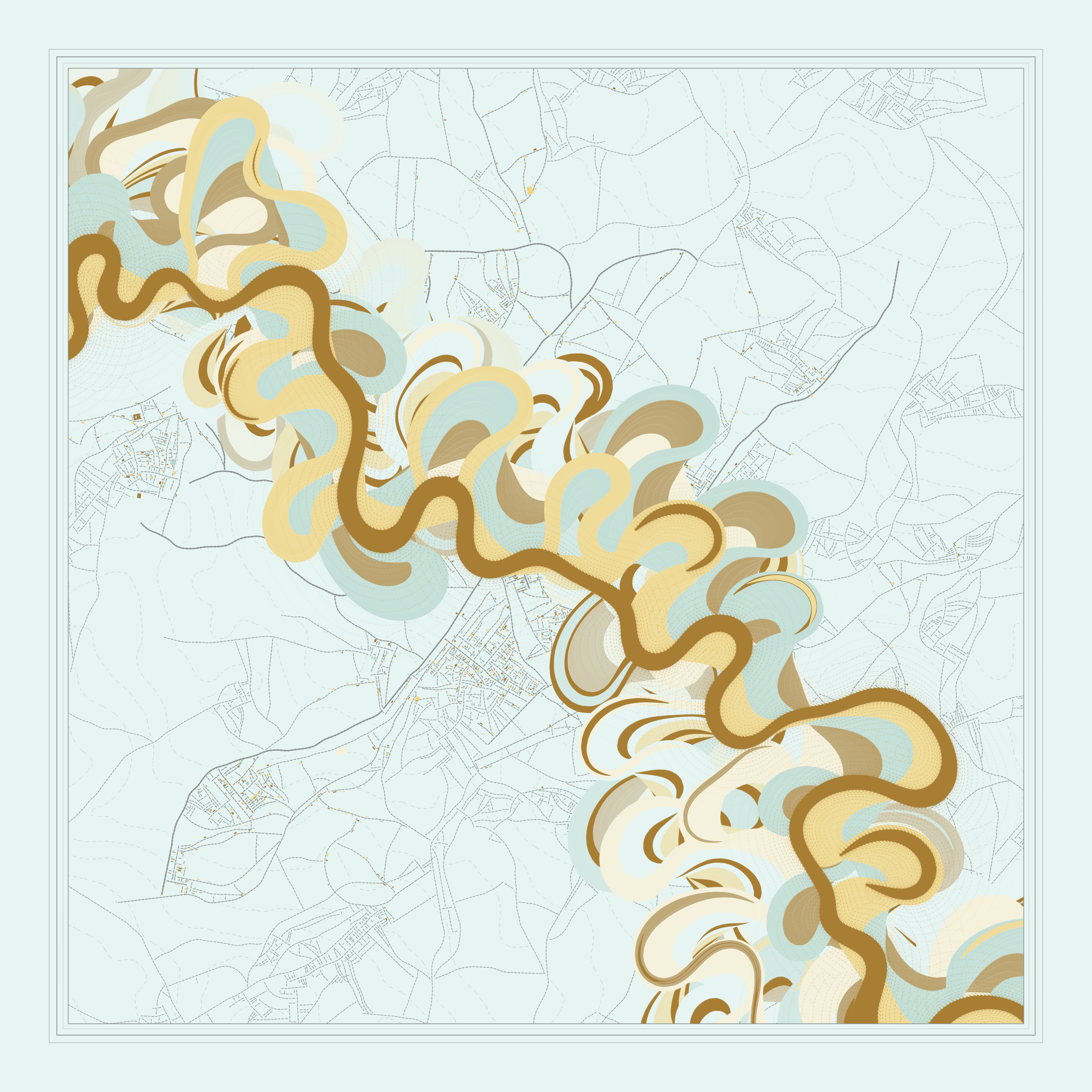 Ancient Courses is a generative experience that explores the aesthetics of meandering rivers and the settlements that form on their banks. The design is graphic and cartographic with bold color palettes rendered against map iconography and line sensibility. From the river banks, roads stretch across the landscape: sometimes a single access road, other times sprawling towns. The river meandering is simulated via a custom algorithm which closely models the real world process.