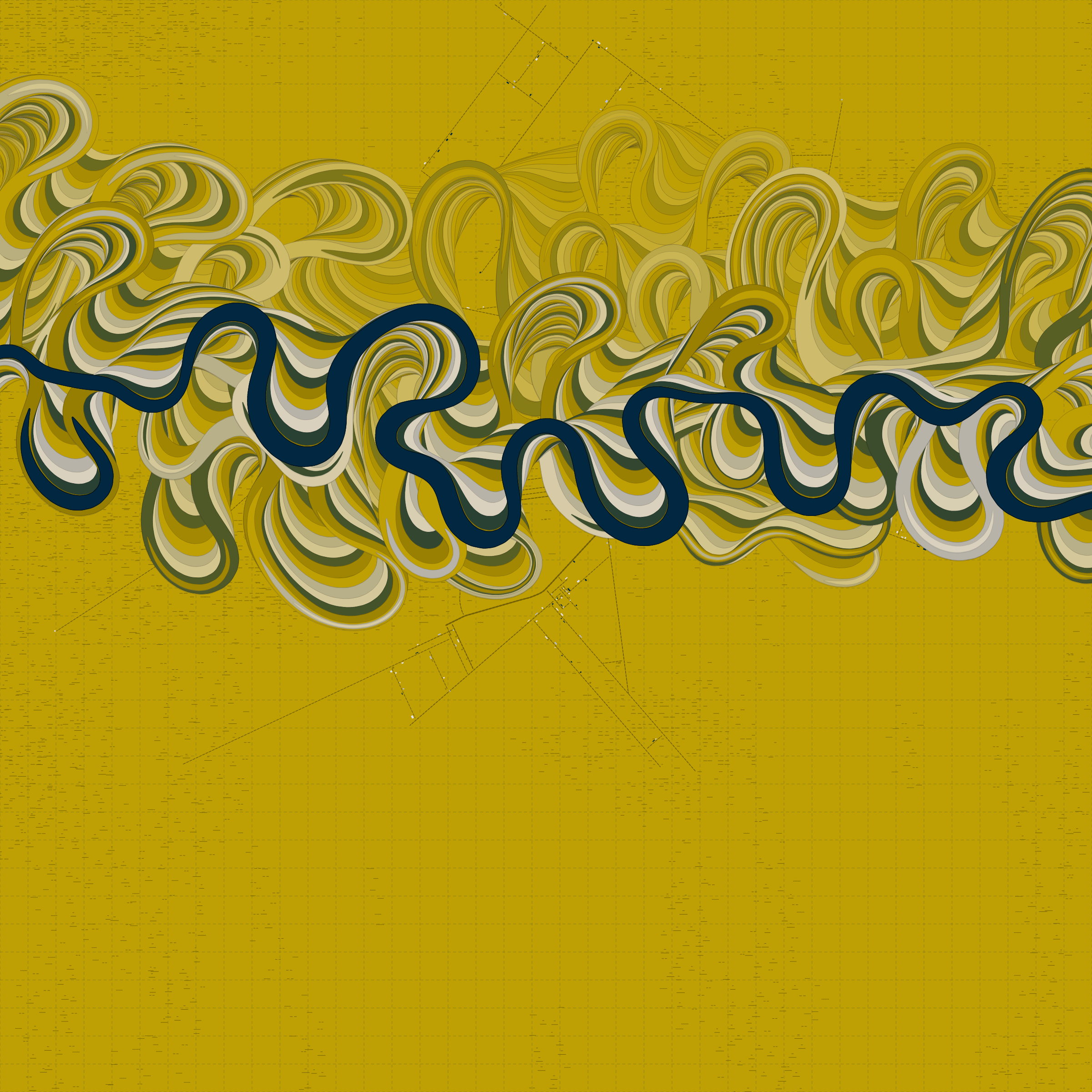 Ancient Courses is a generative experience that explores the aesthetics of meandering rivers and the settlements that form on their banks. The design is graphic and cartographic with bold color palettes rendered against map iconography and line sensibility. From the river banks, roads stretch across the landscape: sometimes a single access road, other times sprawling towns. The river meandering is simulated via a custom algorithm which closely models the real world process.