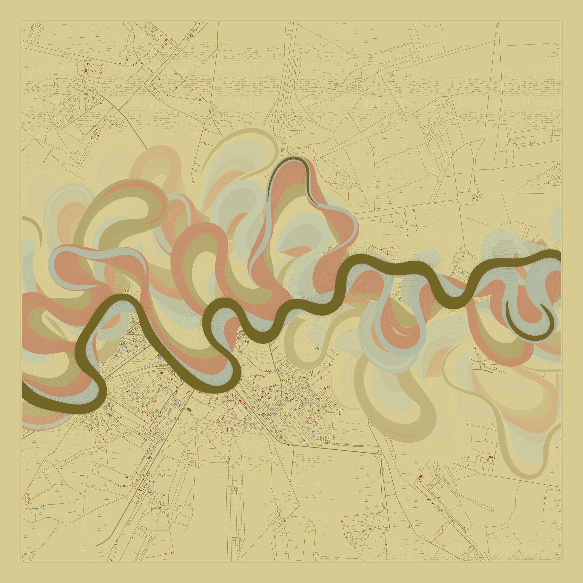 Ancient Courses is a generative experience that explores the aesthetics of meandering rivers and the settlements that form on their banks. The design is graphic and cartographic with bold color palettes rendered against map iconography and line sensibility. From the river banks, roads stretch across the landscape: sometimes a single access road, other times sprawling towns. The river meandering is simulated via a custom algorithm which closely models the real world process.