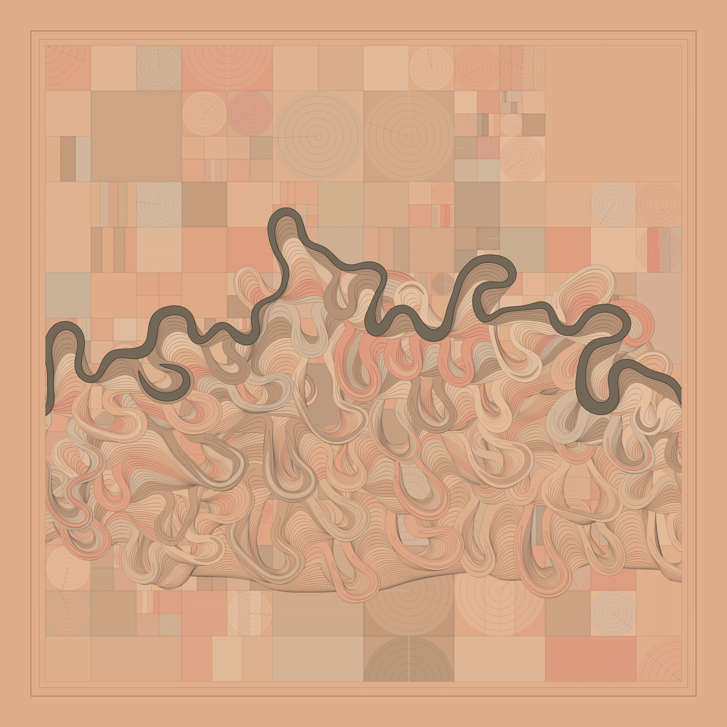 Ancient Courses is a generative experience that explores the aesthetics of meandering rivers and the settlements that form on their banks. The design is graphic and cartographic with bold color palettes rendered against map iconography and line sensibility. From the river banks, roads stretch across the landscape: sometimes a single access road, other times sprawling towns. The river meandering is simulated via a custom algorithm which closely models the real world process.