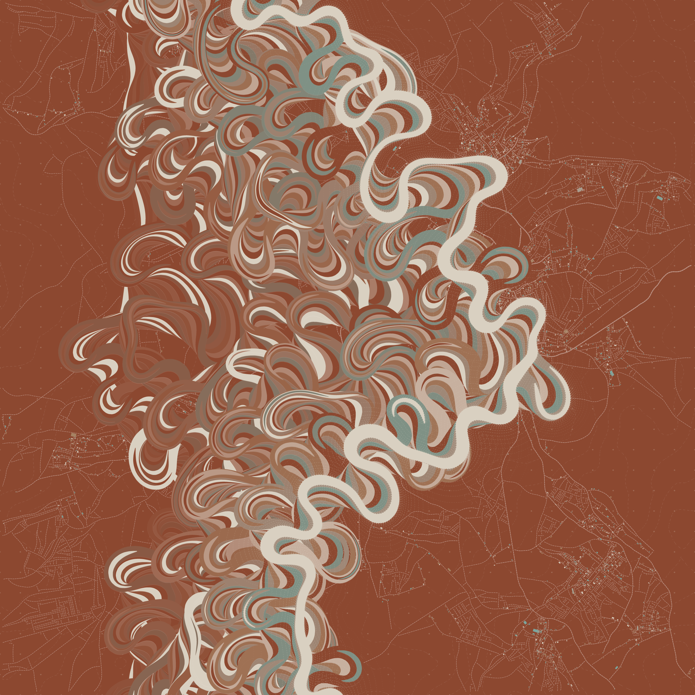 Ancient Courses is a generative experience that explores the aesthetics of meandering rivers and the settlements that form on their banks. The design is graphic and cartographic with bold color palettes rendered against map iconography and line sensibility. From the river banks, roads stretch across the landscape: sometimes a single access road, other times sprawling towns. The river meandering is simulated via a custom algorithm which closely models the real world process.