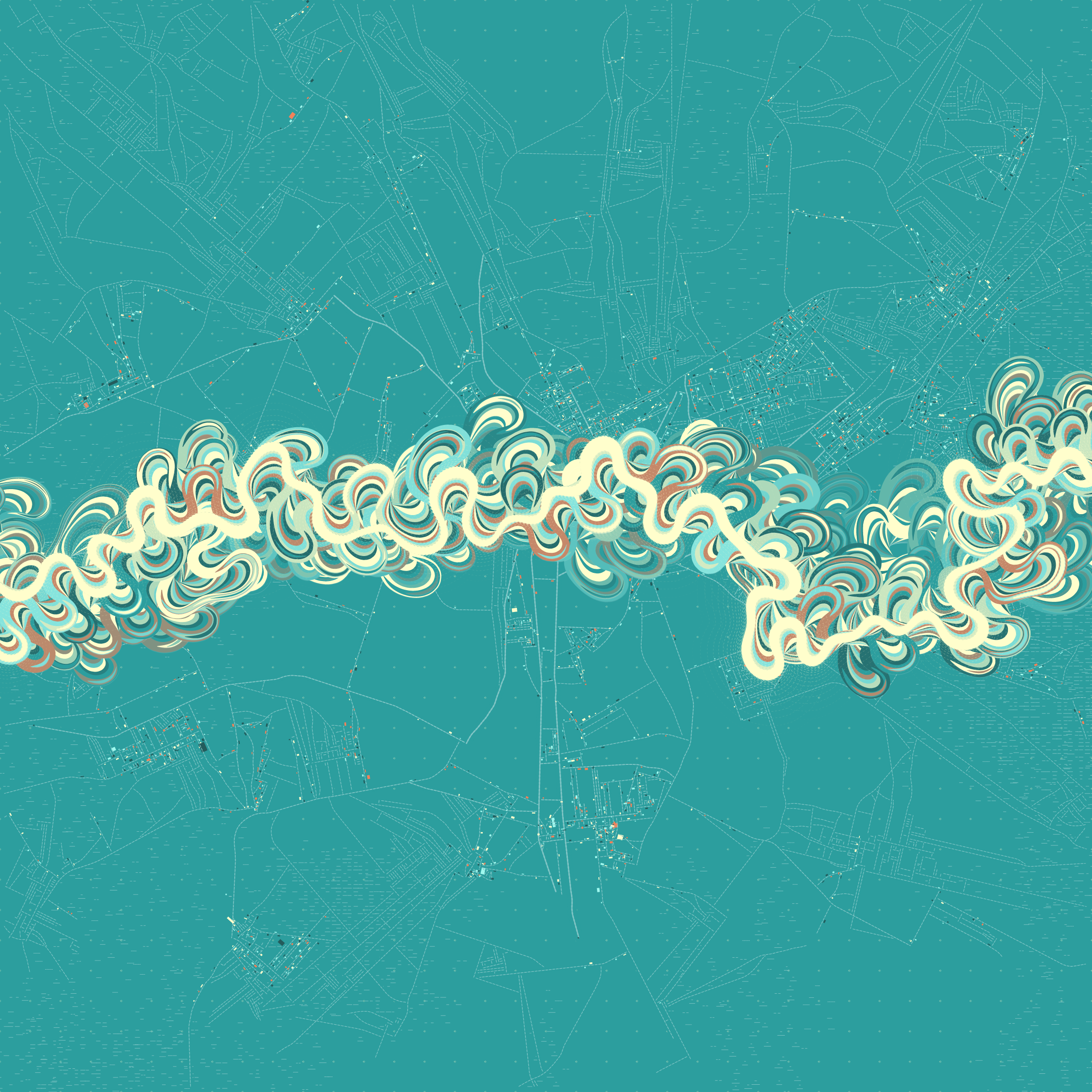 Ancient Courses is a generative experience that explores the aesthetics of meandering rivers and the settlements that form on their banks. The design is graphic and cartographic with bold color palettes rendered against map iconography and line sensibility. From the river banks, roads stretch across the landscape: sometimes a single access road, other times sprawling towns. The river meandering is simulated via a custom algorithm which closely models the real world process.