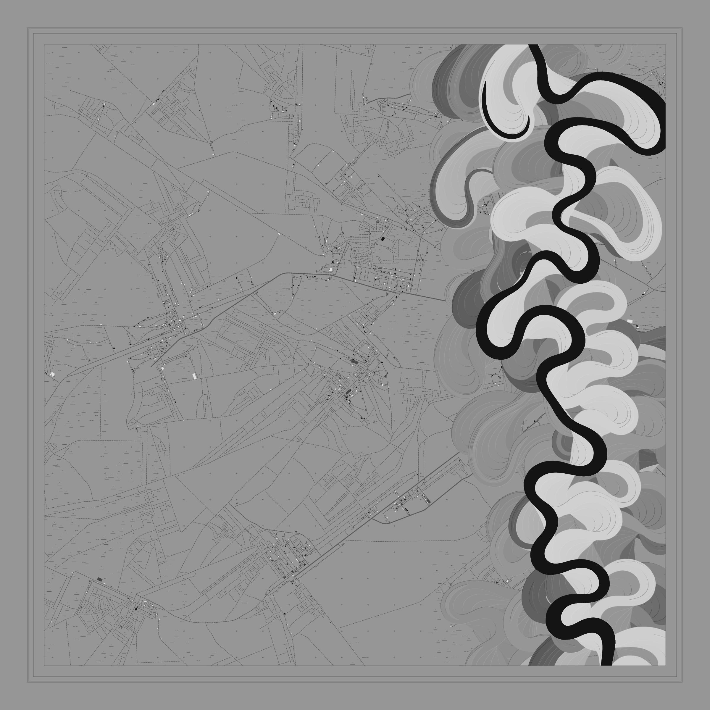 Ancient Courses is a generative experience that explores the aesthetics of meandering rivers and the settlements that form on their banks. The design is graphic and cartographic with bold color palettes rendered against map iconography and line sensibility. From the river banks, roads stretch across the landscape: sometimes a single access road, other times sprawling towns. The river meandering is simulated via a custom algorithm which closely models the real world process.