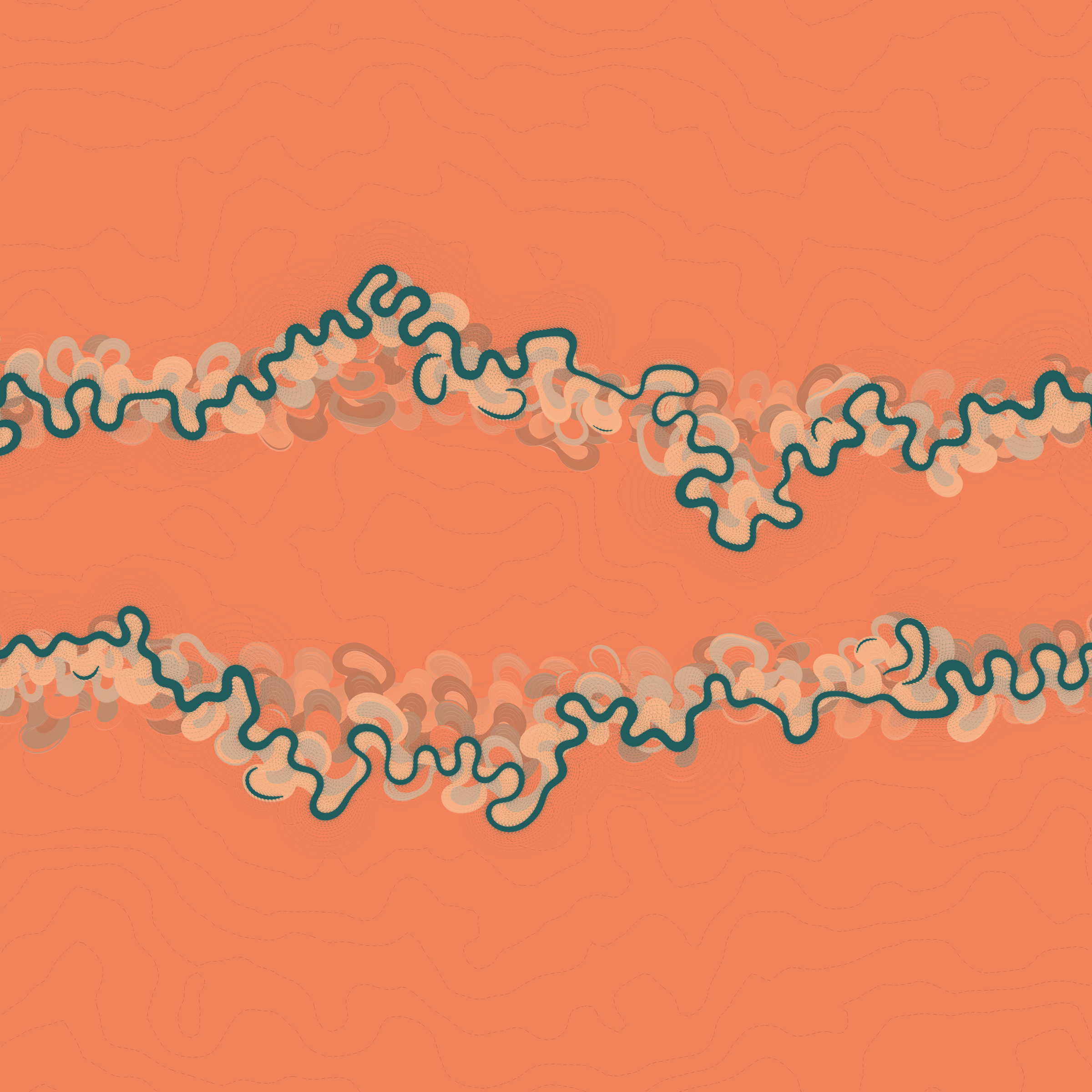 Ancient Courses is a generative experience that explores the aesthetics of meandering rivers and the settlements that form on their banks. The design is graphic and cartographic with bold color palettes rendered against map iconography and line sensibility. From the river banks, roads stretch across the landscape: sometimes a single access road, other times sprawling towns. The river meandering is simulated via a custom algorithm which closely models the real world process.