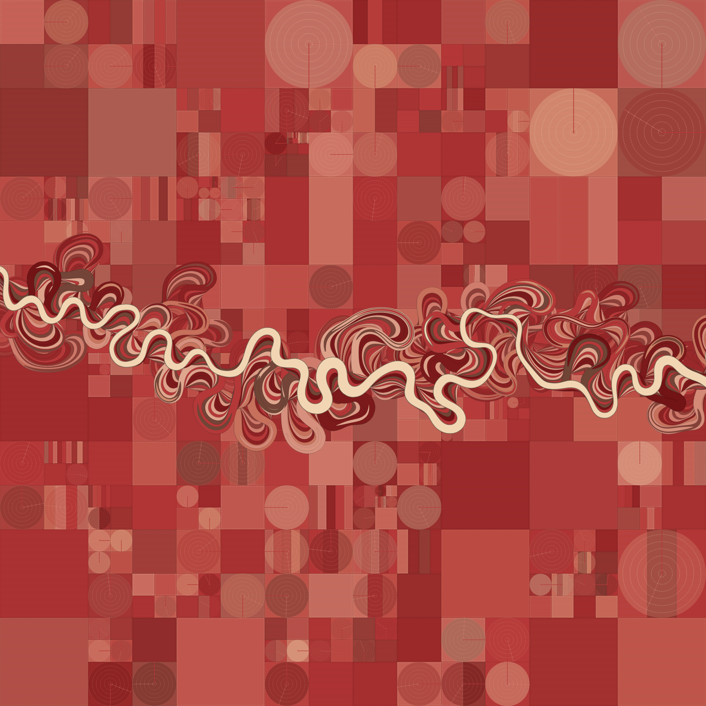 Ancient Courses is a generative experience that explores the aesthetics of meandering rivers and the settlements that form on their banks. The design is graphic and cartographic with bold color palettes rendered against map iconography and line sensibility. From the river banks, roads stretch across the landscape: sometimes a single access road, other times sprawling towns. The river meandering is simulated via a custom algorithm which closely models the real world process.