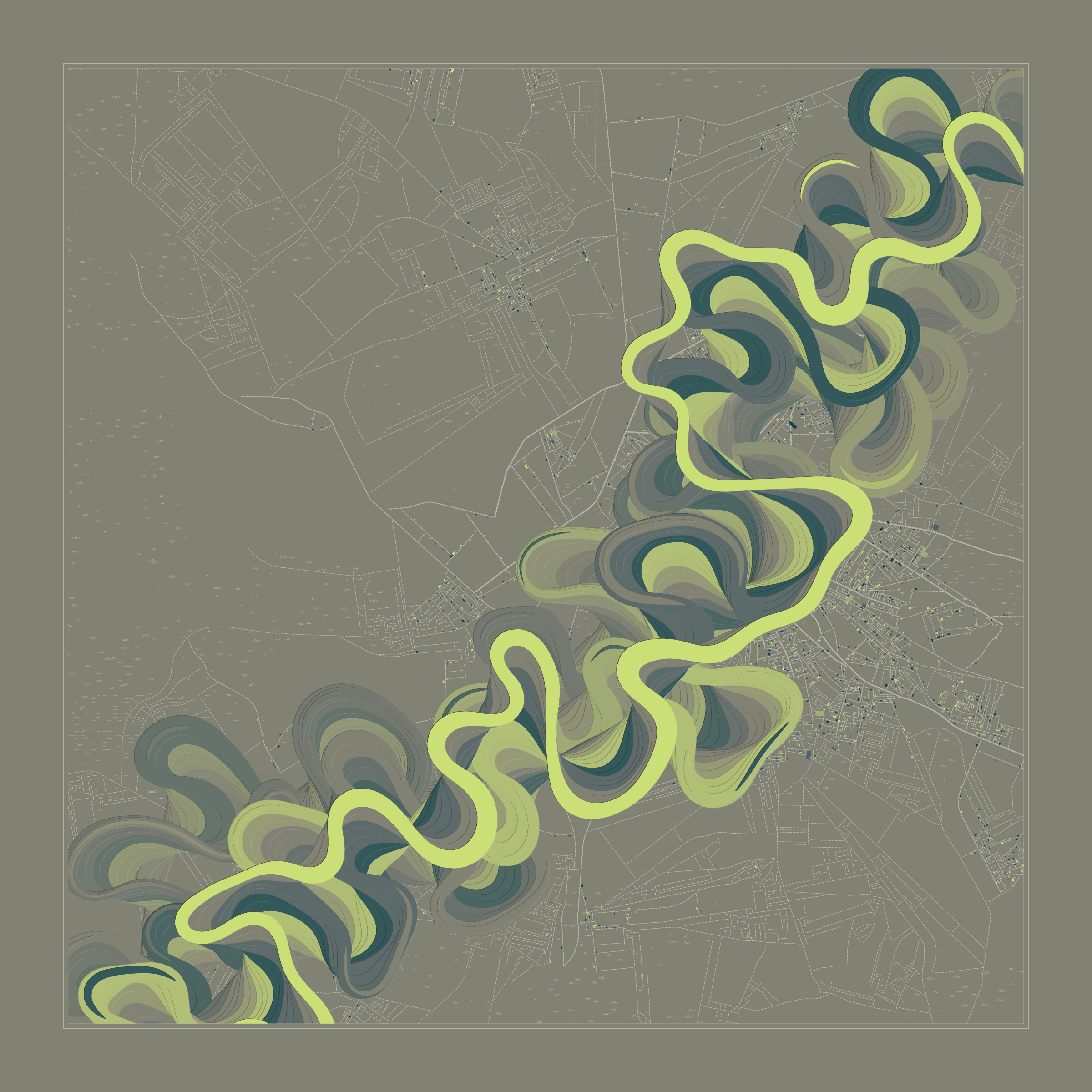 Ancient Courses is a generative experience that explores the aesthetics of meandering rivers and the settlements that form on their banks. The design is graphic and cartographic with bold color palettes rendered against map iconography and line sensibility. From the river banks, roads stretch across the landscape: sometimes a single access road, other times sprawling towns. The river meandering is simulated via a custom algorithm which closely models the real world process.