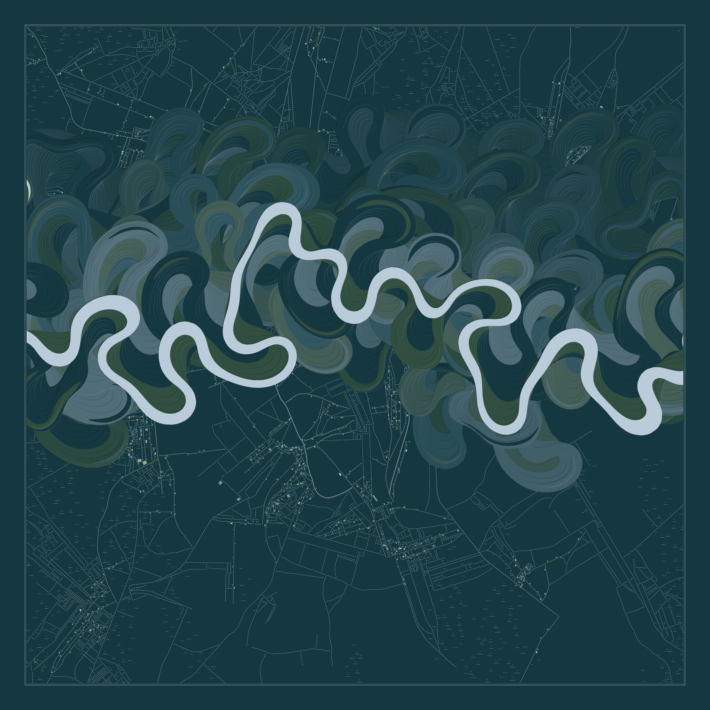 Ancient Courses is a generative experience that explores the aesthetics of meandering rivers and the settlements that form on their banks. The design is graphic and cartographic with bold color palettes rendered against map iconography and line sensibility. From the river banks, roads stretch across the landscape: sometimes a single access road, other times sprawling towns. The river meandering is simulated via a custom algorithm which closely models the real world process.