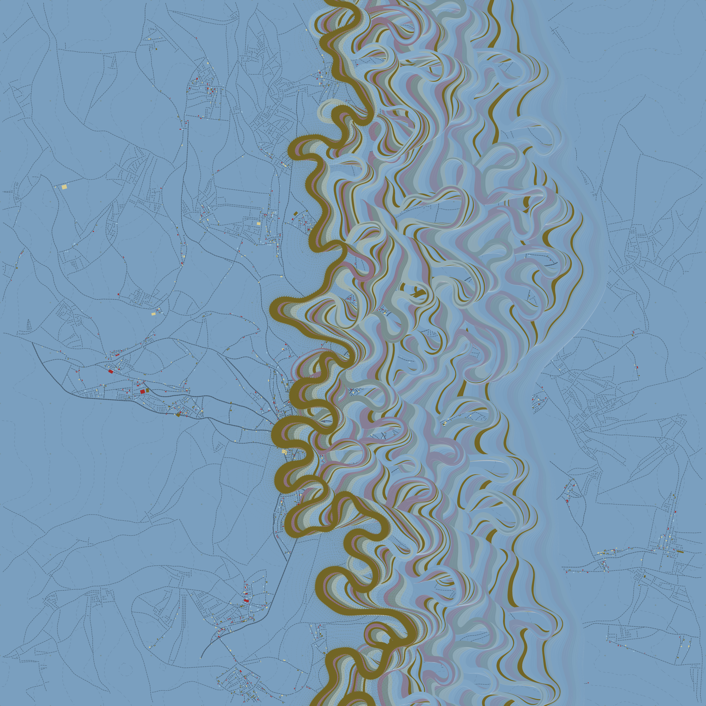 Ancient Courses is a generative experience that explores the aesthetics of meandering rivers and the settlements that form on their banks. The design is graphic and cartographic with bold color palettes rendered against map iconography and line sensibility. From the river banks, roads stretch across the landscape: sometimes a single access road, other times sprawling towns. The river meandering is simulated via a custom algorithm which closely models the real world process.