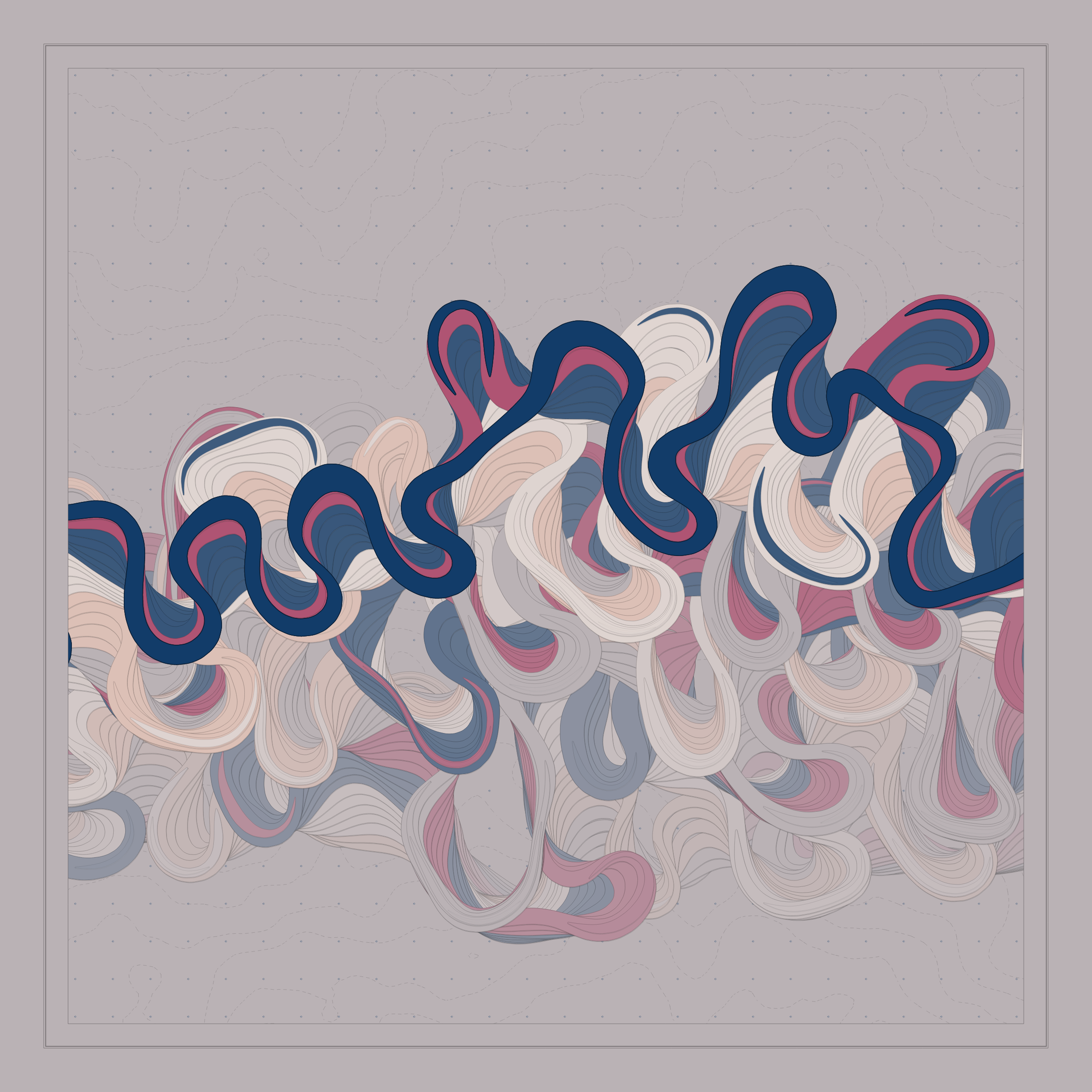 Ancient Courses is a generative experience that explores the aesthetics of meandering rivers and the settlements that form on their banks. The design is graphic and cartographic with bold color palettes rendered against map iconography and line sensibility. From the river banks, roads stretch across the landscape: sometimes a single access road, other times sprawling towns. The river meandering is simulated via a custom algorithm which closely models the real world process.