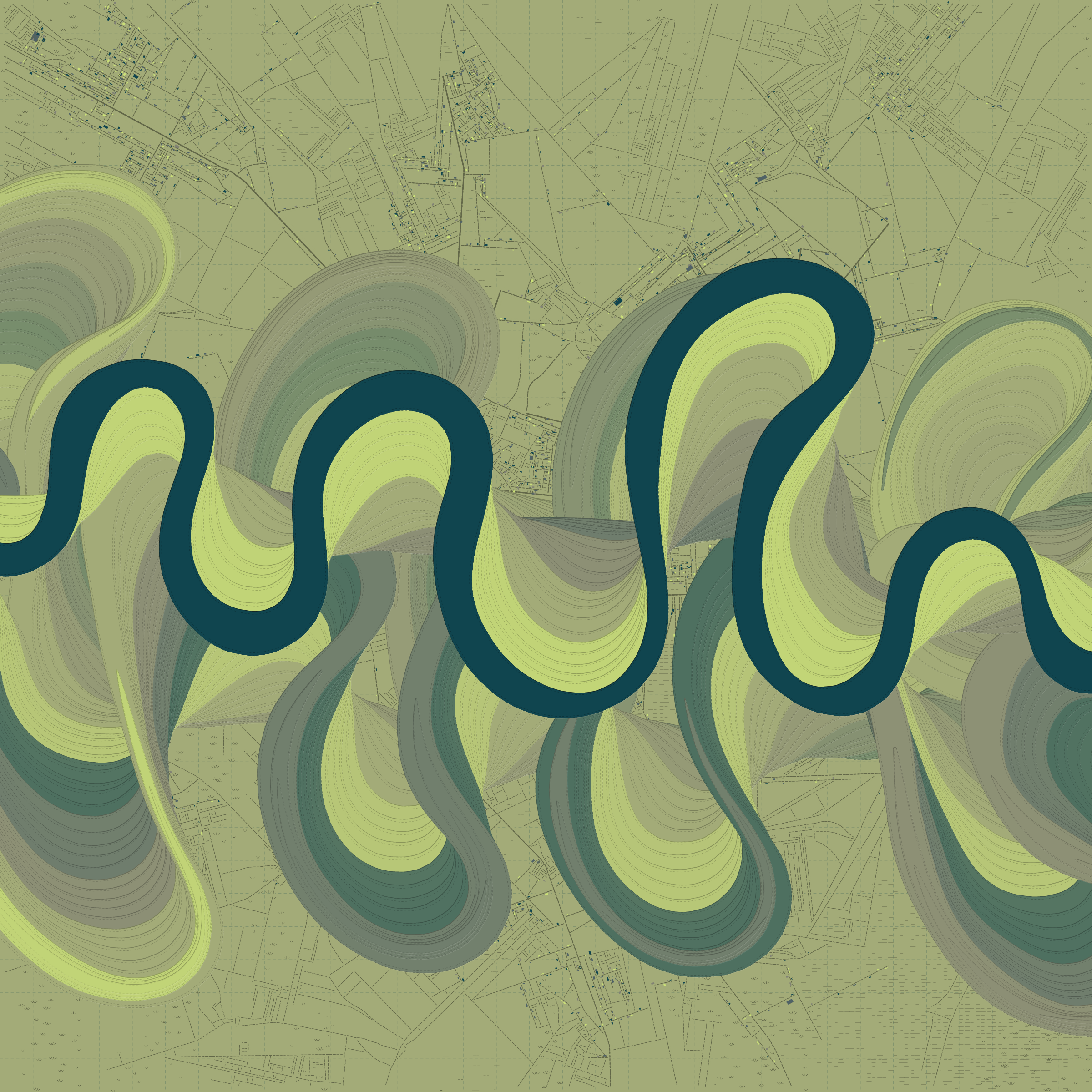 Ancient Courses is a generative experience that explores the aesthetics of meandering rivers and the settlements that form on their banks. The design is graphic and cartographic with bold color palettes rendered against map iconography and line sensibility. From the river banks, roads stretch across the landscape: sometimes a single access road, other times sprawling towns. The river meandering is simulated via a custom algorithm which closely models the real world process.