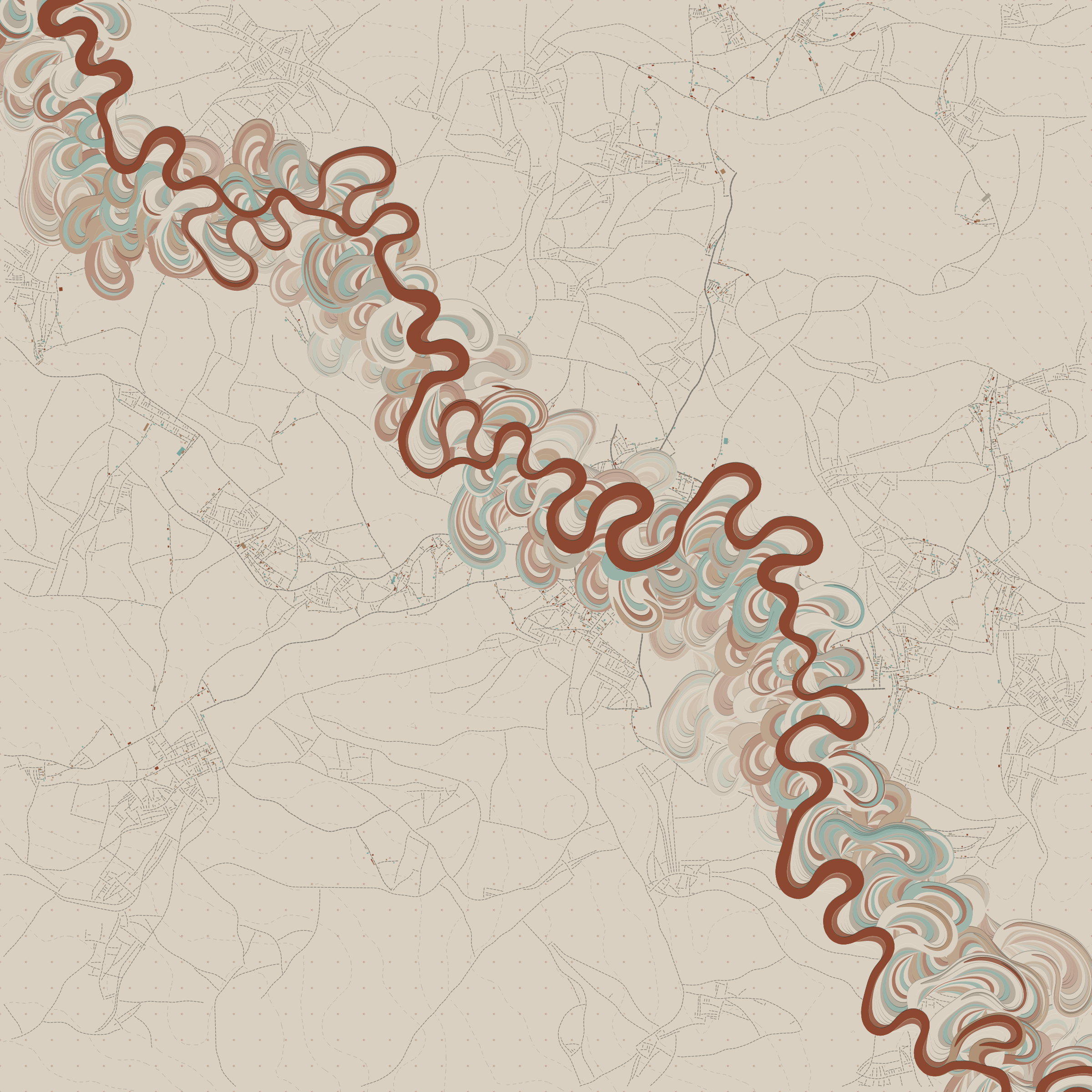 Ancient Courses is a generative experience that explores the aesthetics of meandering rivers and the settlements that form on their banks. The design is graphic and cartographic with bold color palettes rendered against map iconography and line sensibility. From the river banks, roads stretch across the landscape: sometimes a single access road, other times sprawling towns. The river meandering is simulated via a custom algorithm which closely models the real world process.