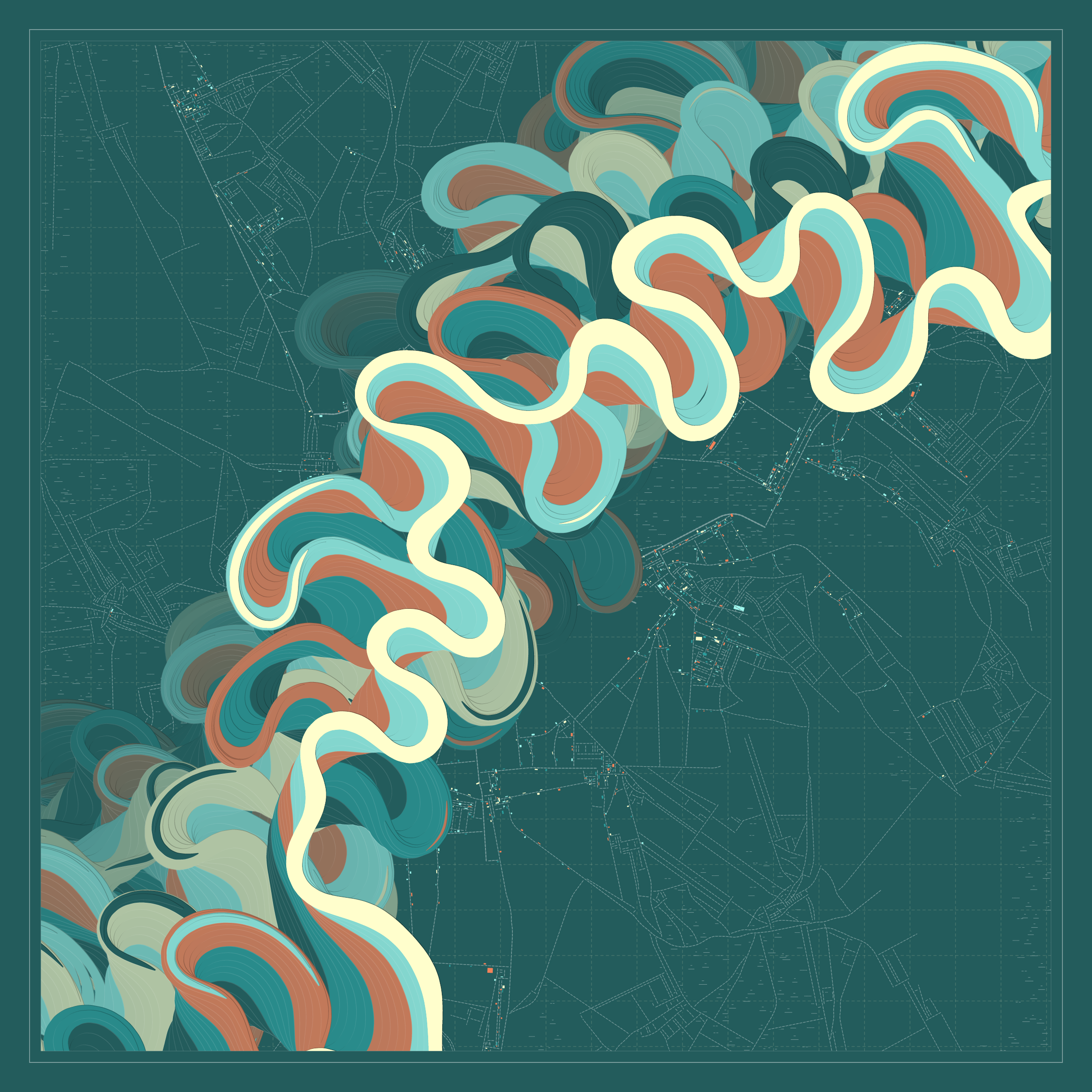 Ancient Courses is a generative experience that explores the aesthetics of meandering rivers and the settlements that form on their banks. The design is graphic and cartographic with bold color palettes rendered against map iconography and line sensibility. From the river banks, roads stretch across the landscape: sometimes a single access road, other times sprawling towns. The river meandering is simulated via a custom algorithm which closely models the real world process.