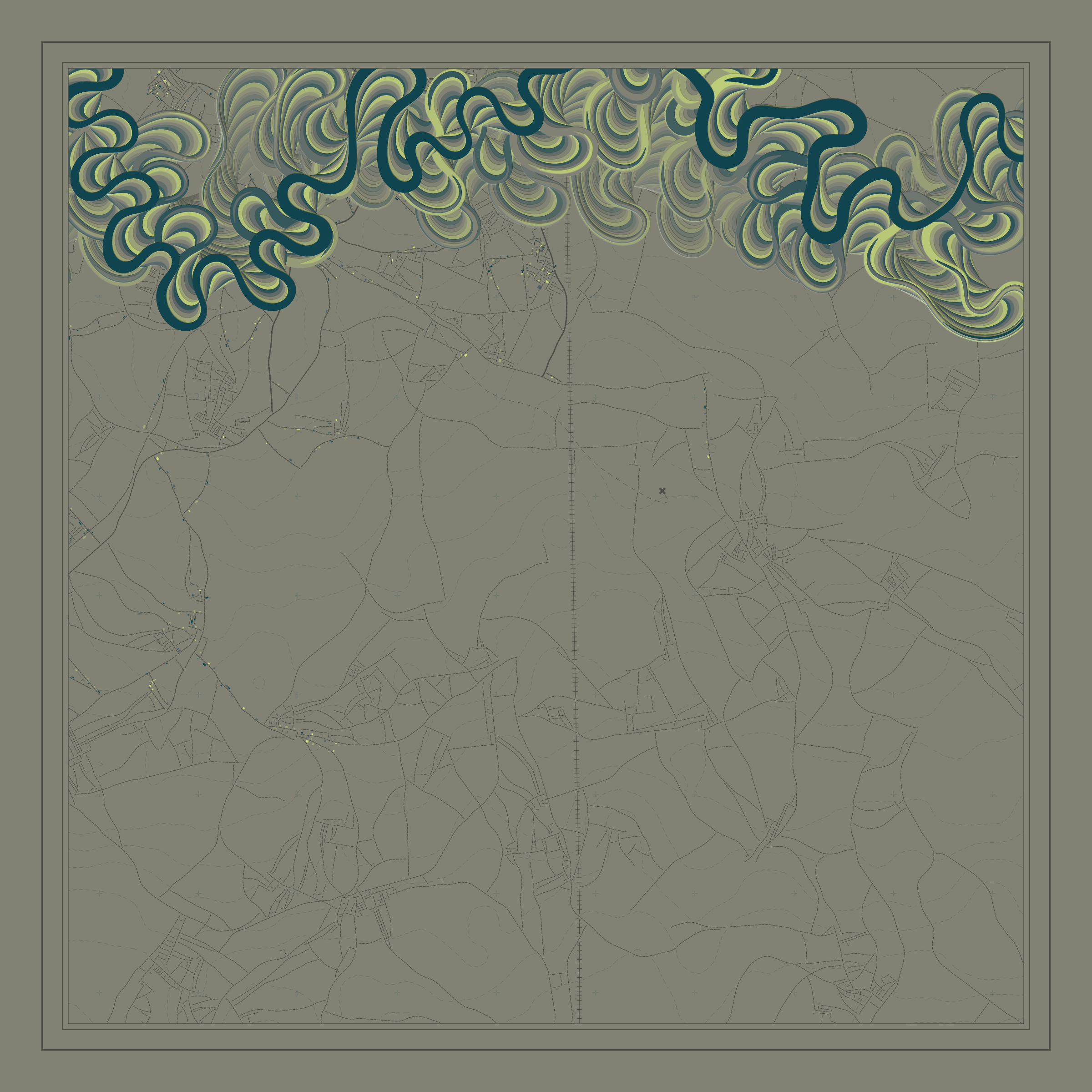 Ancient Courses is a generative experience that explores the aesthetics of meandering rivers and the settlements that form on their banks. The design is graphic and cartographic with bold color palettes rendered against map iconography and line sensibility. From the river banks, roads stretch across the landscape: sometimes a single access road, other times sprawling towns. The river meandering is simulated via a custom algorithm which closely models the real world process.
