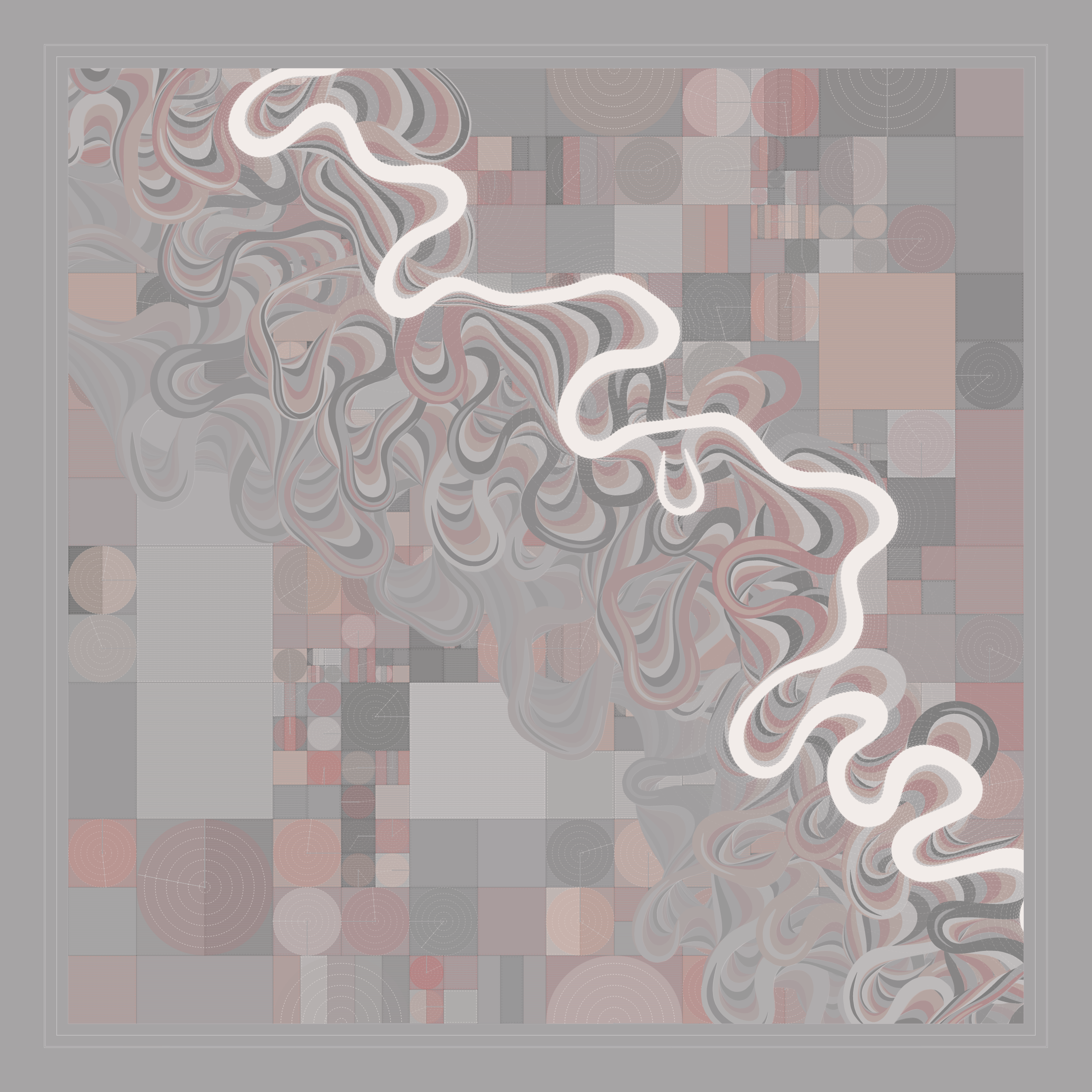 Ancient Courses is a generative experience that explores the aesthetics of meandering rivers and the settlements that form on their banks. The design is graphic and cartographic with bold color palettes rendered against map iconography and line sensibility. From the river banks, roads stretch across the landscape: sometimes a single access road, other times sprawling towns. The river meandering is simulated via a custom algorithm which closely models the real world process.