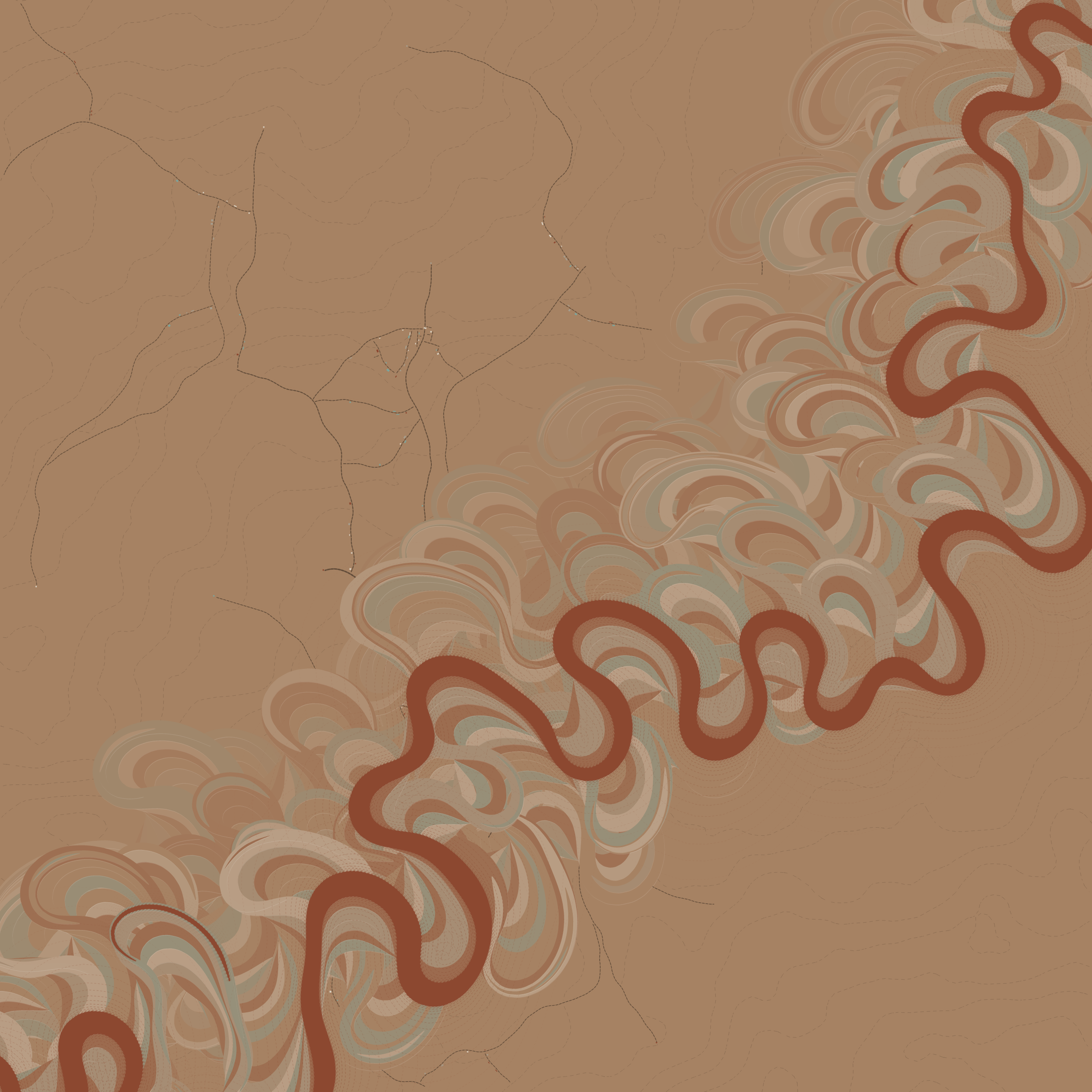 Ancient Courses is a generative experience that explores the aesthetics of meandering rivers and the settlements that form on their banks. The design is graphic and cartographic with bold color palettes rendered against map iconography and line sensibility. From the river banks, roads stretch across the landscape: sometimes a single access road, other times sprawling towns. The river meandering is simulated via a custom algorithm which closely models the real world process.