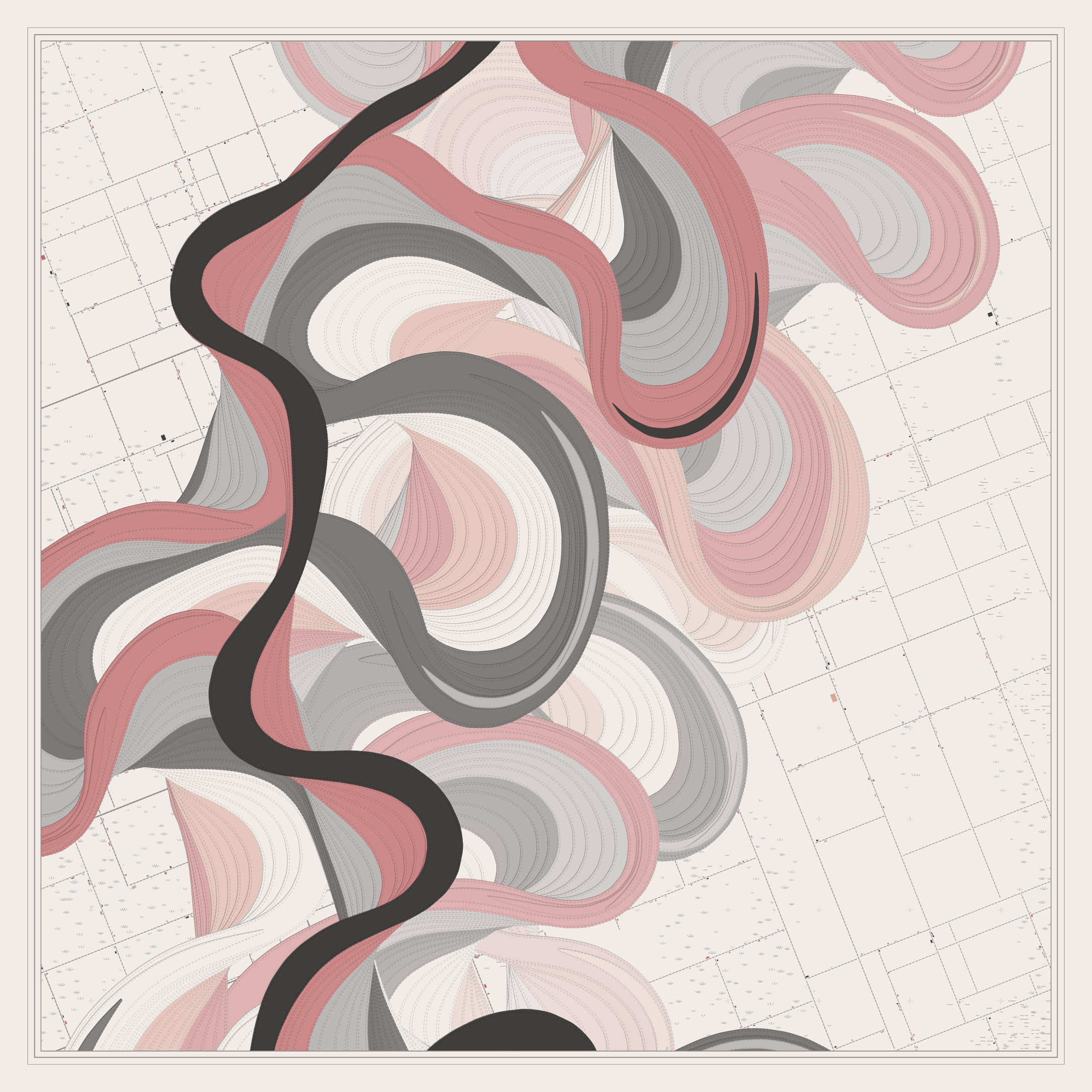 Ancient Courses is a generative experience that explores the aesthetics of meandering rivers and the settlements that form on their banks. The design is graphic and cartographic with bold color palettes rendered against map iconography and line sensibility. From the river banks, roads stretch across the landscape: sometimes a single access road, other times sprawling towns. The river meandering is simulated via a custom algorithm which closely models the real world process.