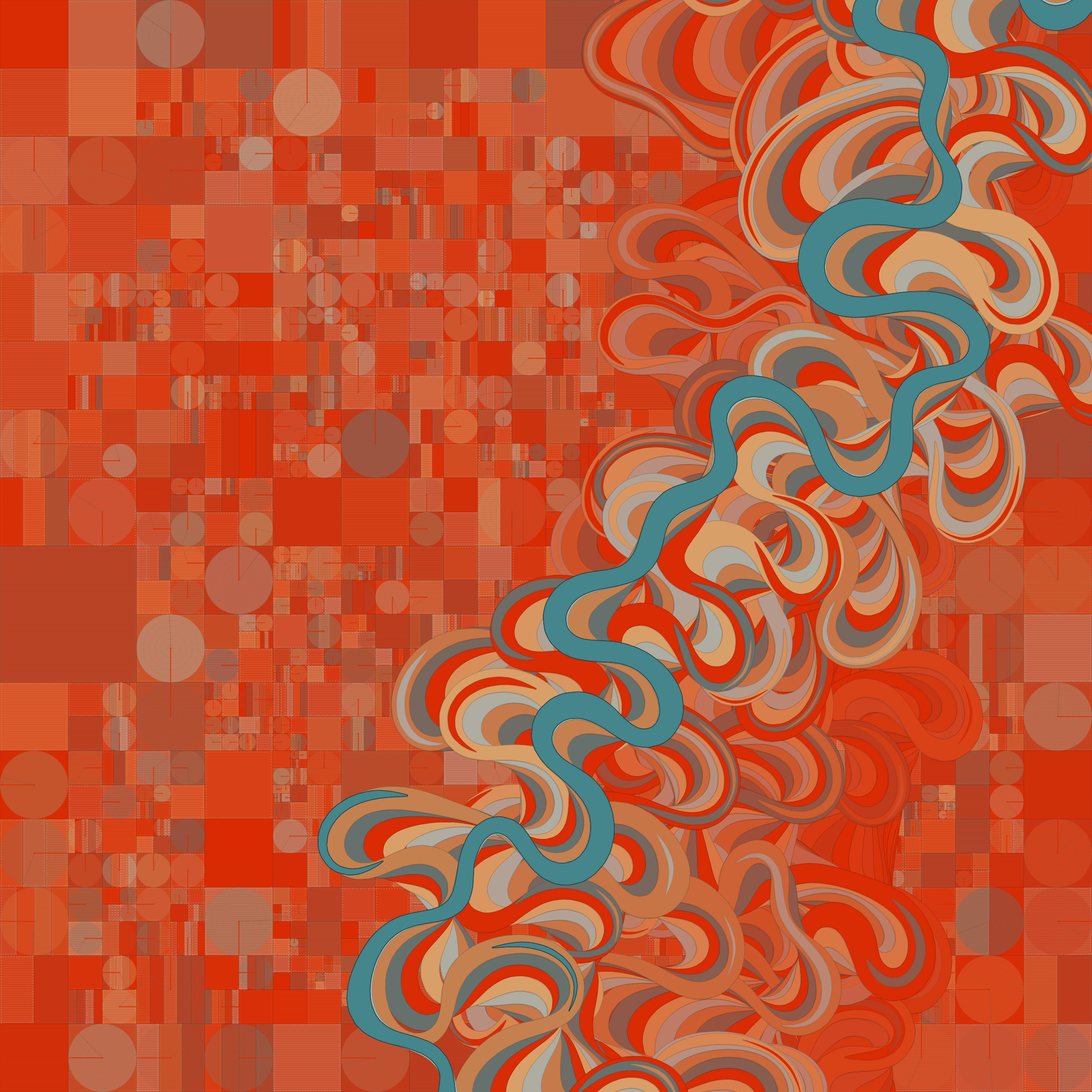 Ancient Courses is a generative experience that explores the aesthetics of meandering rivers and the settlements that form on their banks. The design is graphic and cartographic with bold color palettes rendered against map iconography and line sensibility. From the river banks, roads stretch across the landscape: sometimes a single access road, other times sprawling towns. The river meandering is simulated via a custom algorithm which closely models the real world process.