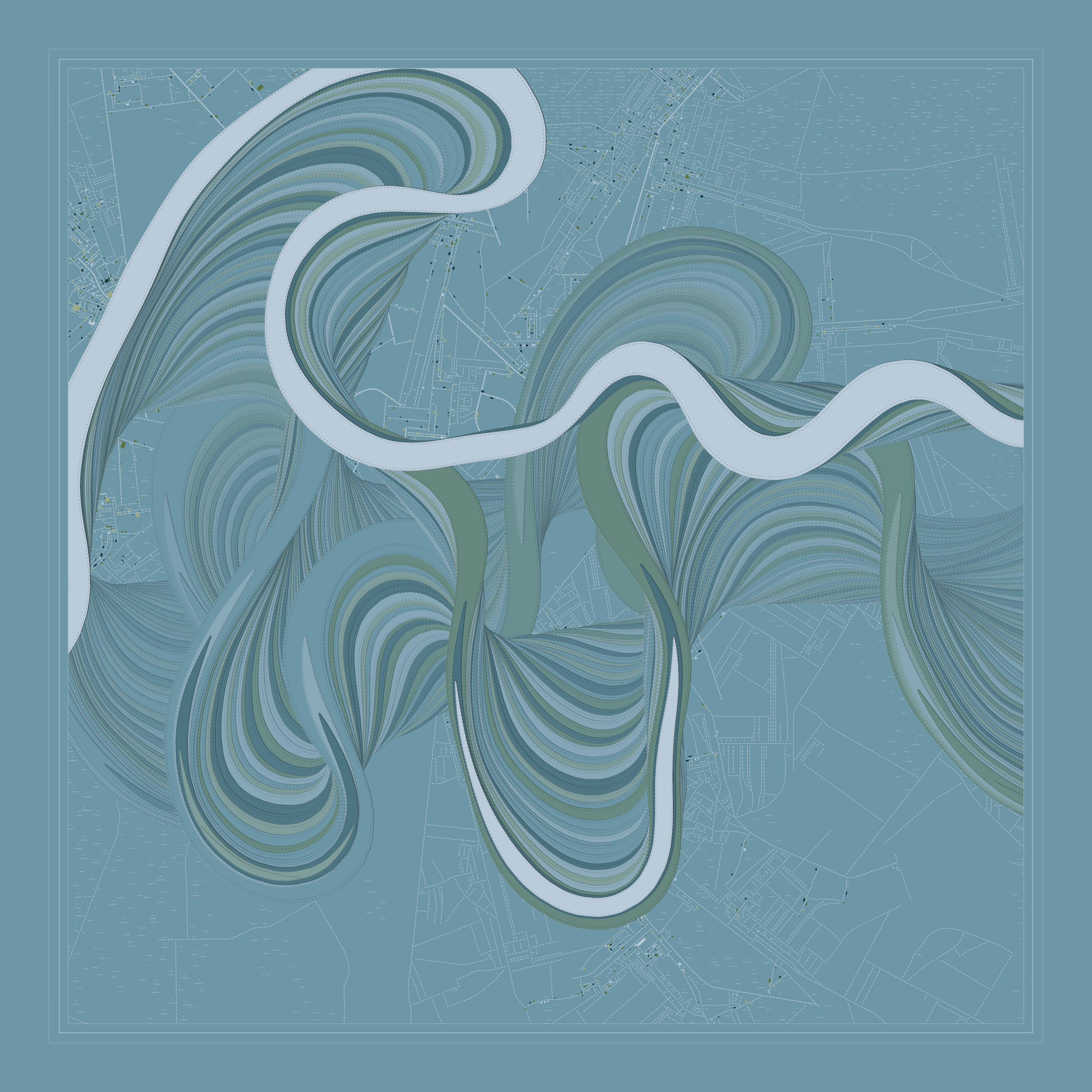Ancient Courses is a generative experience that explores the aesthetics of meandering rivers and the settlements that form on their banks. The design is graphic and cartographic with bold color palettes rendered against map iconography and line sensibility. From the river banks, roads stretch across the landscape: sometimes a single access road, other times sprawling towns. The river meandering is simulated via a custom algorithm which closely models the real world process.