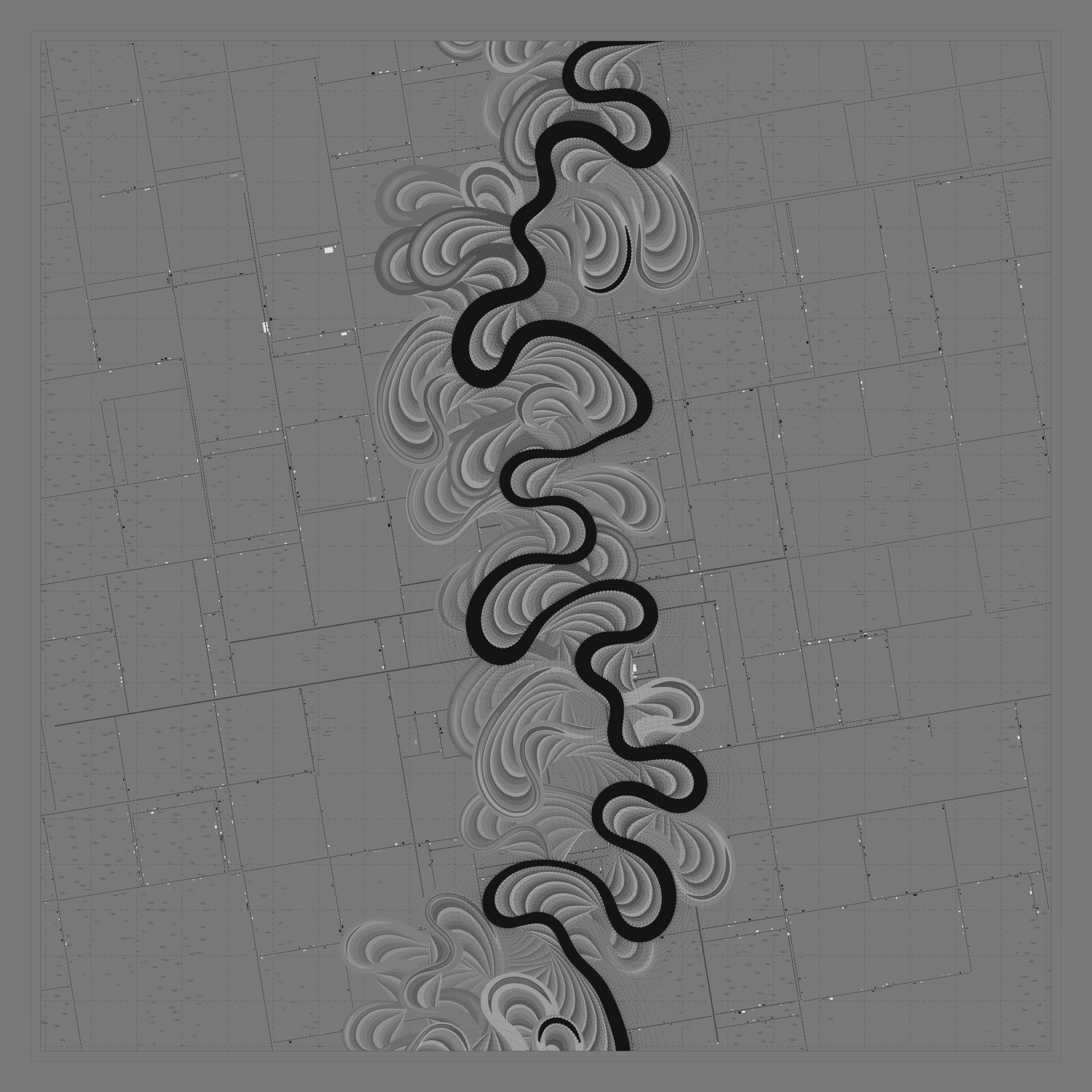 Ancient Courses is a generative experience that explores the aesthetics of meandering rivers and the settlements that form on their banks. The design is graphic and cartographic with bold color palettes rendered against map iconography and line sensibility. From the river banks, roads stretch across the landscape: sometimes a single access road, other times sprawling towns. The river meandering is simulated via a custom algorithm which closely models the real world process.